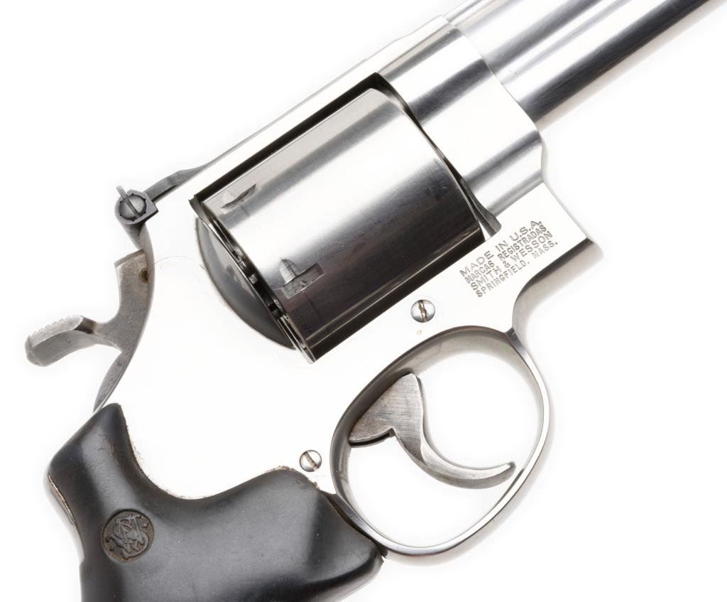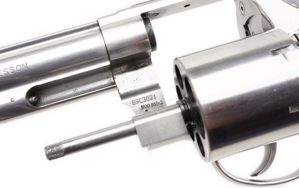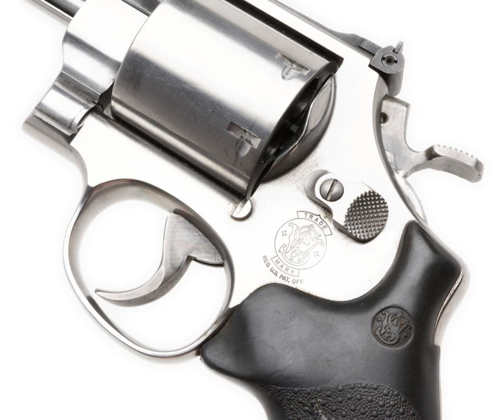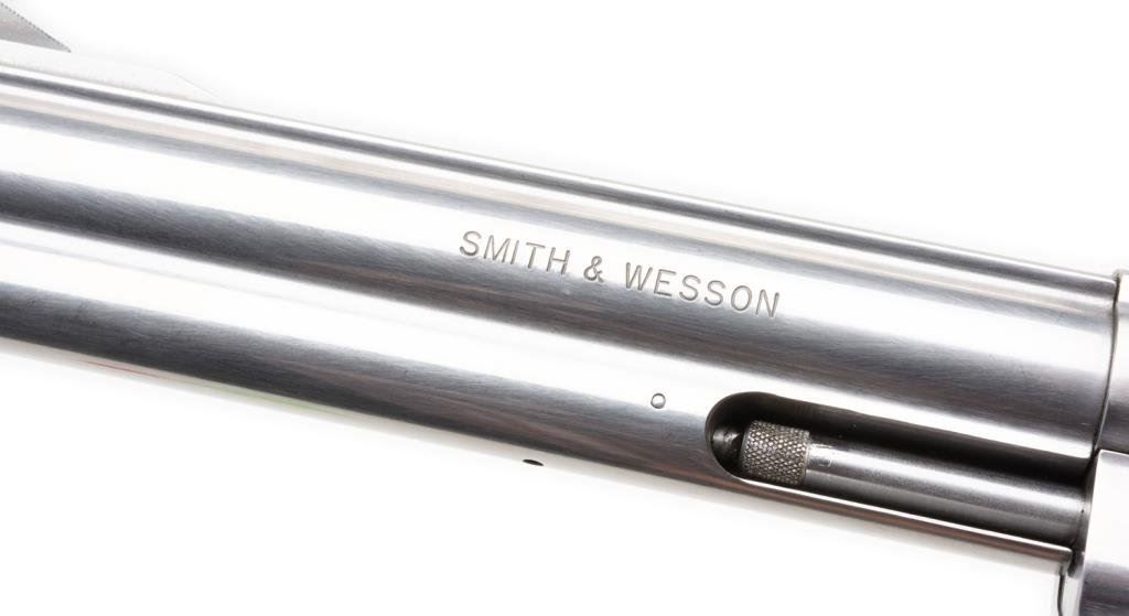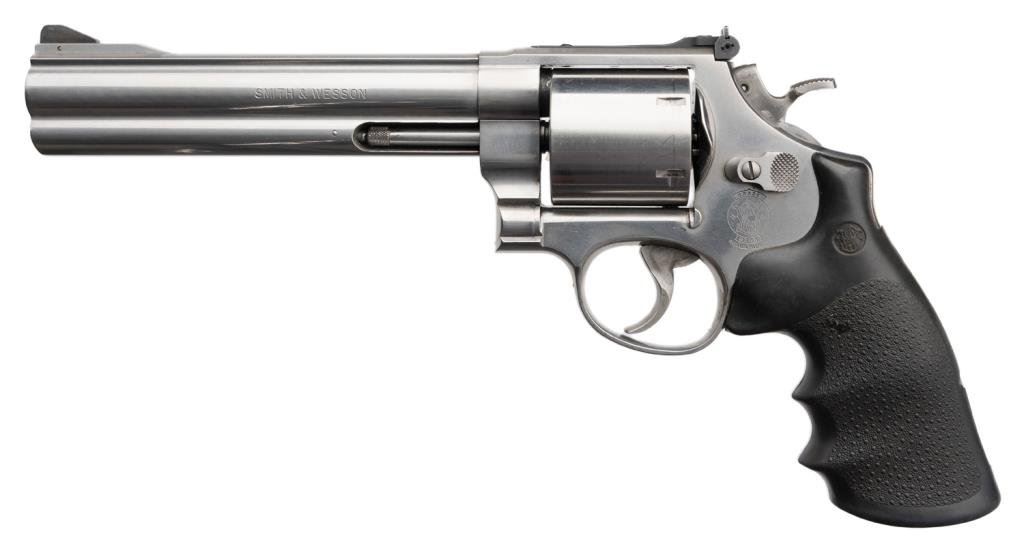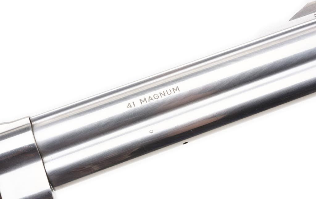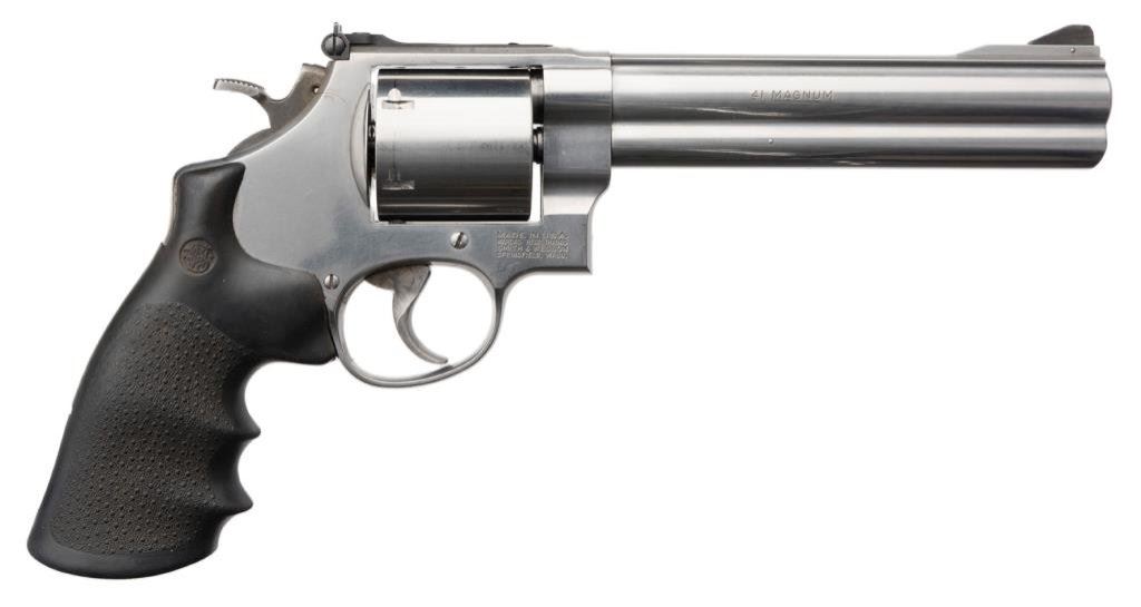 S&W model 657-2 D.A. revolver in .41 mag caliber, stainless steel with S&W logo, 6 ½” BBL and neoprene grips. In very good used condition. Scarce and hard to find. Est.: $750-$1500