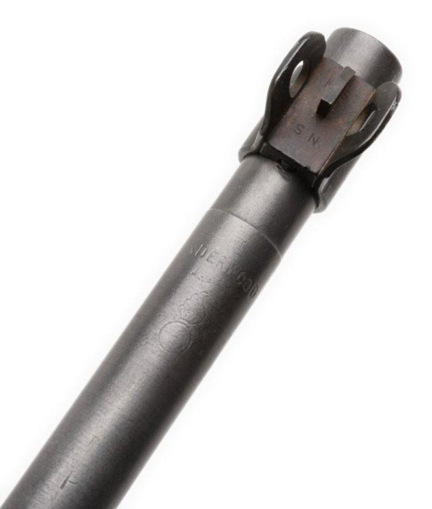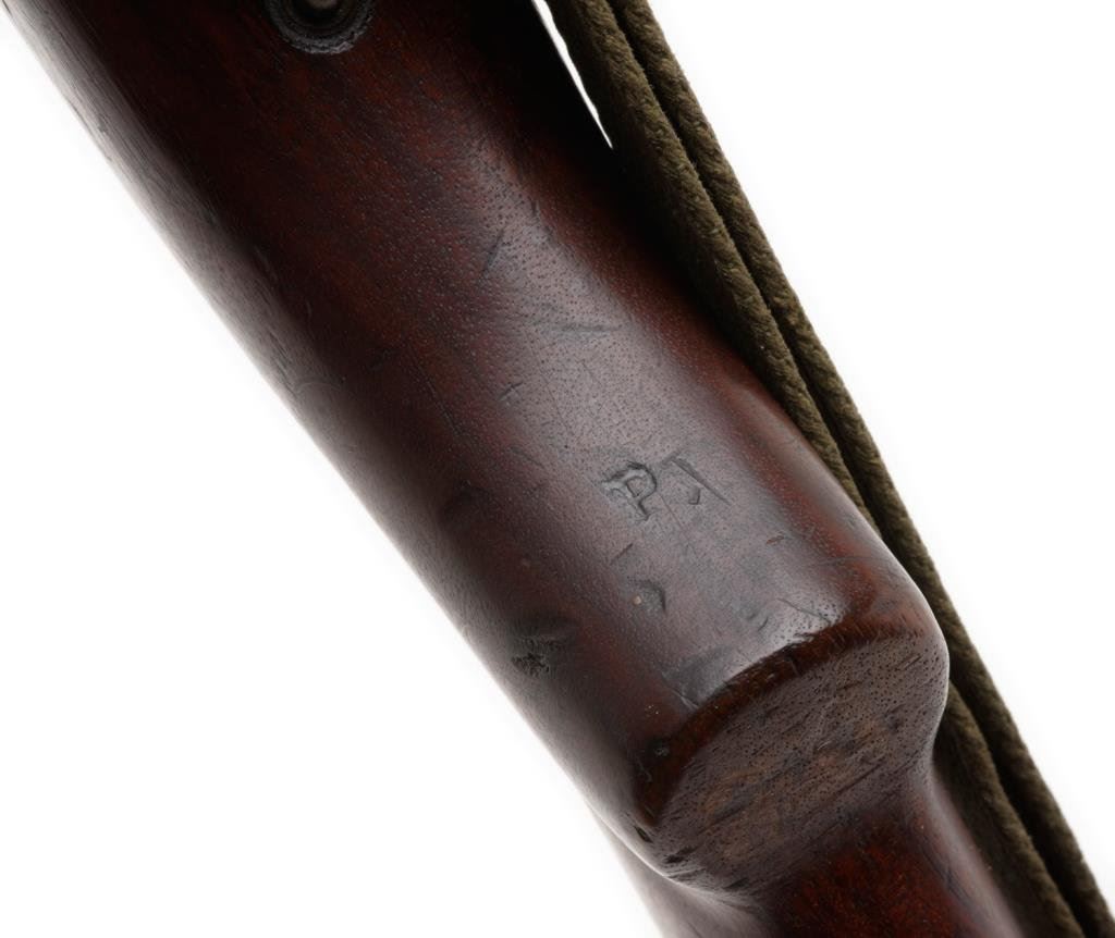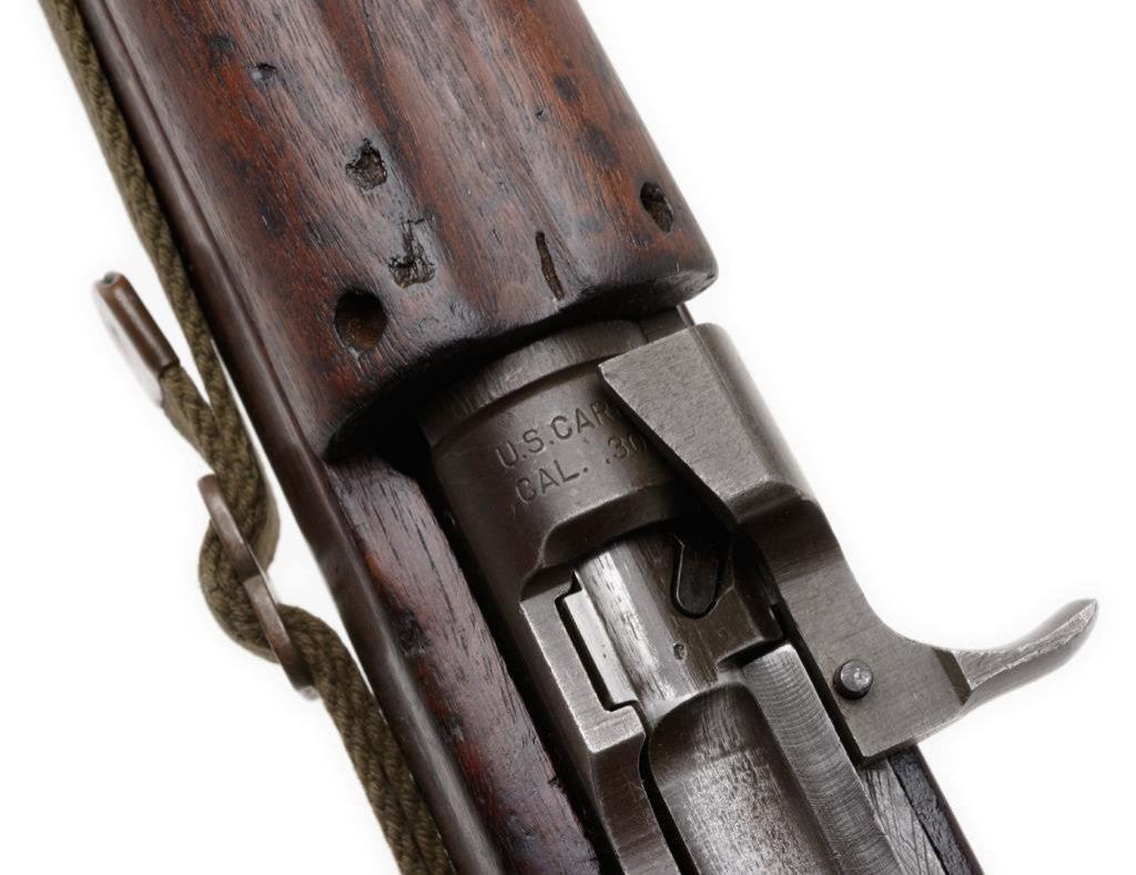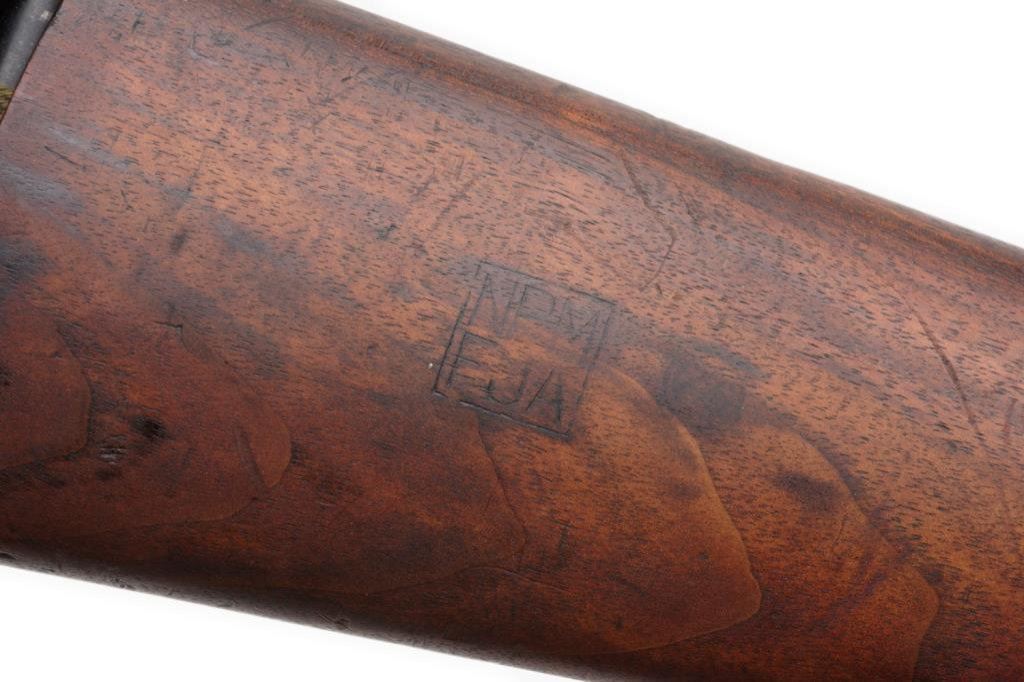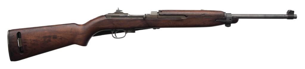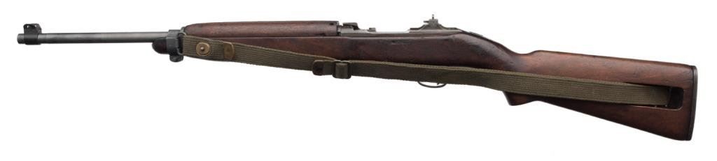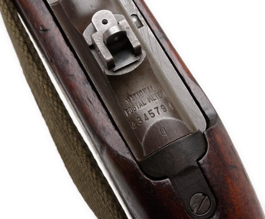 U.S. M1 semi-automatic carbine by National Postal Meter, .30 caliber, 18” Underwood barrel, S/N 4345794, no magazine, flat bolt, early rear sight, wood stock, woven sling and oiler; crossed cannons and “NPM/FJA” cartouches on right side of butt stock; overall very good condition. Est.: $1,100-$1,600.