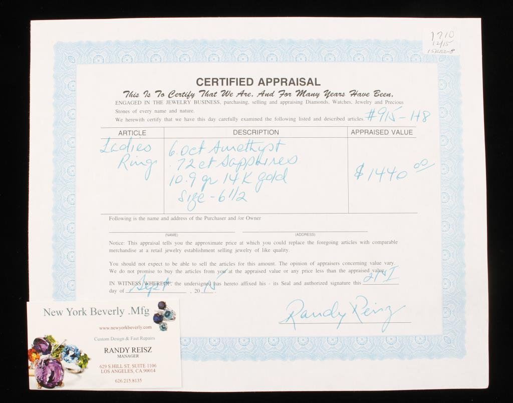 Ladies circa 1940's-1950's ring set with 6.0 carat Amethyst and approx. .72 carats Sapphires in 14K gold, size 6 1/2. Est:$600-1,200