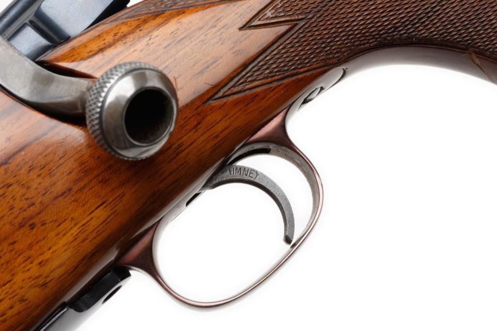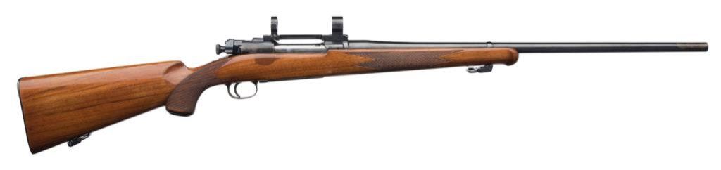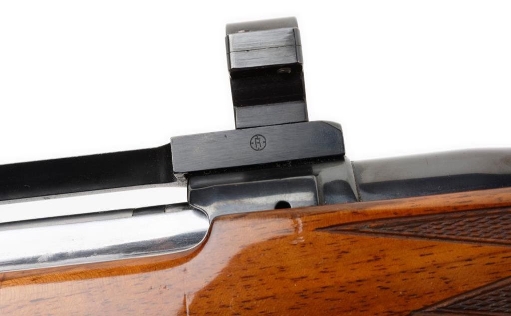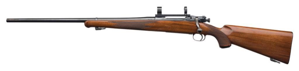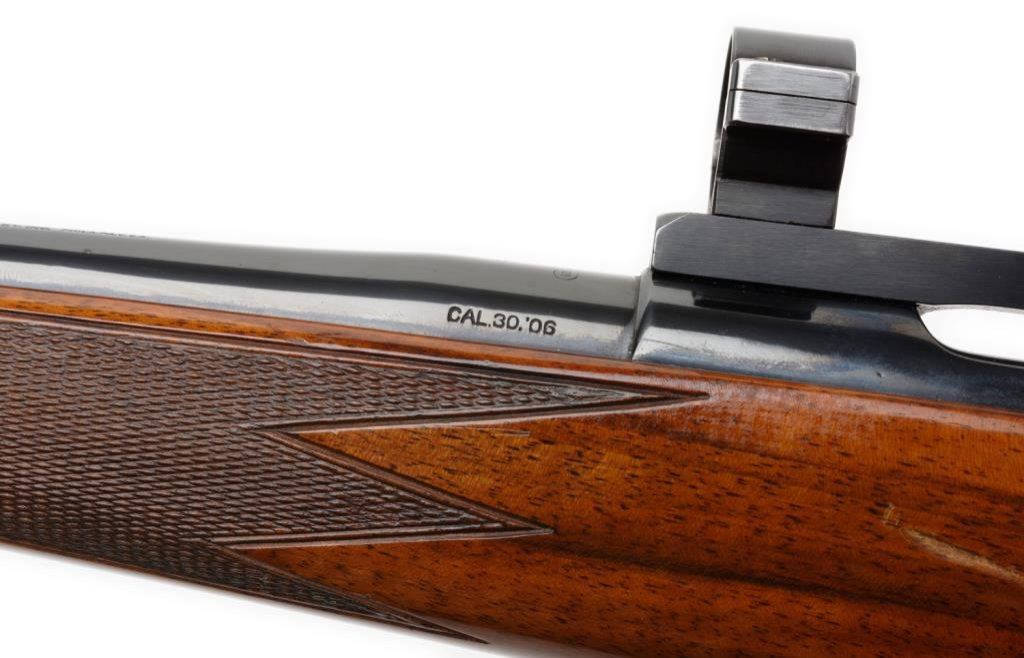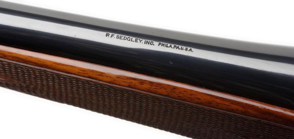 *Custom Left Handed 03 Springfield by R.F. Sedgley bolt action rifle, 30-06 cal., serial #NSNV. The rifle is in overall very good to nearly excellent condition with a 24” barrel. The barreled action is marked R.F. Sedgley on the barrel and retains nearly all of its high polish blue finish except for losses on the right side of the barel at the muzzle and right side of the action. The finely checkered stock is in overall very good condition with with a 1” scratch on the right side of the action and a schnable fore end. The buttstock is completed by a checkered metal butt plate with sling swivels added. The bore is very good, the action smooth and markings legible. A fine R.F. Sedgley custom for a left hander, topped with a Redfield one-piece mount and rings. Est.: $600-$1,200.