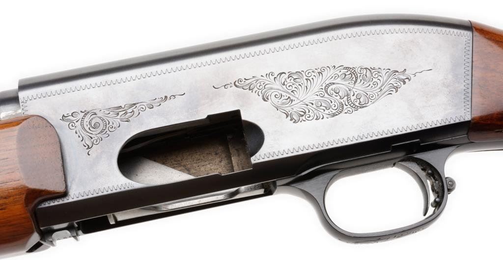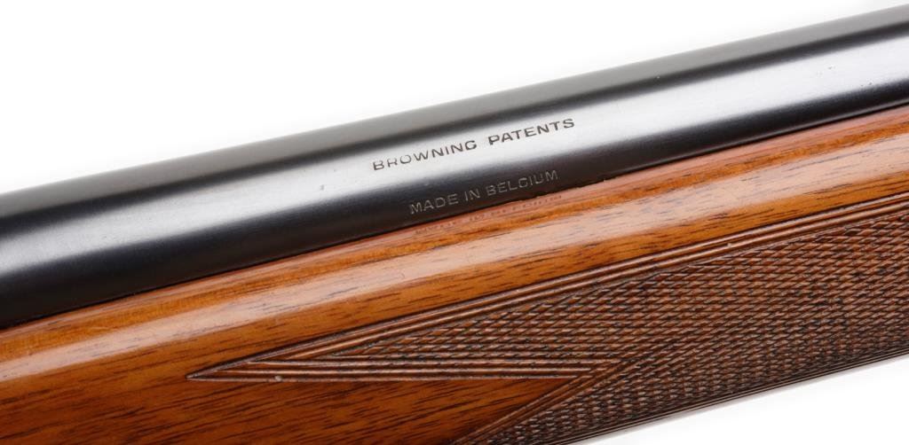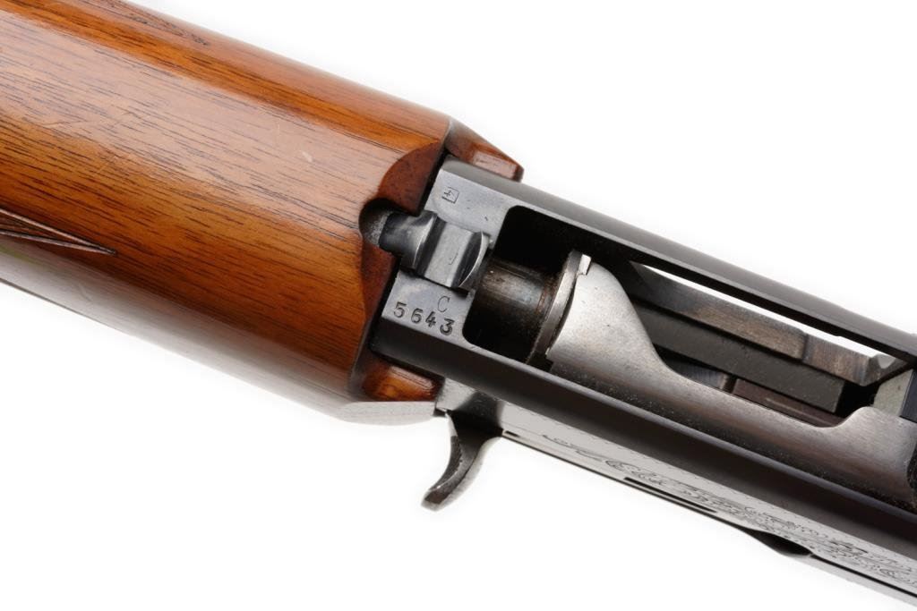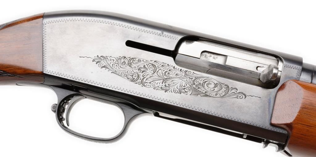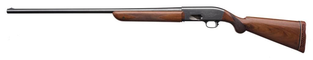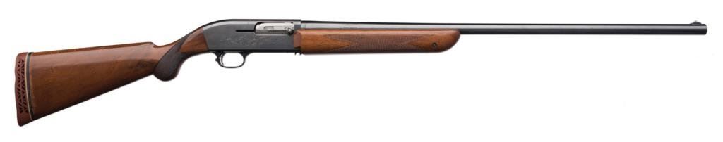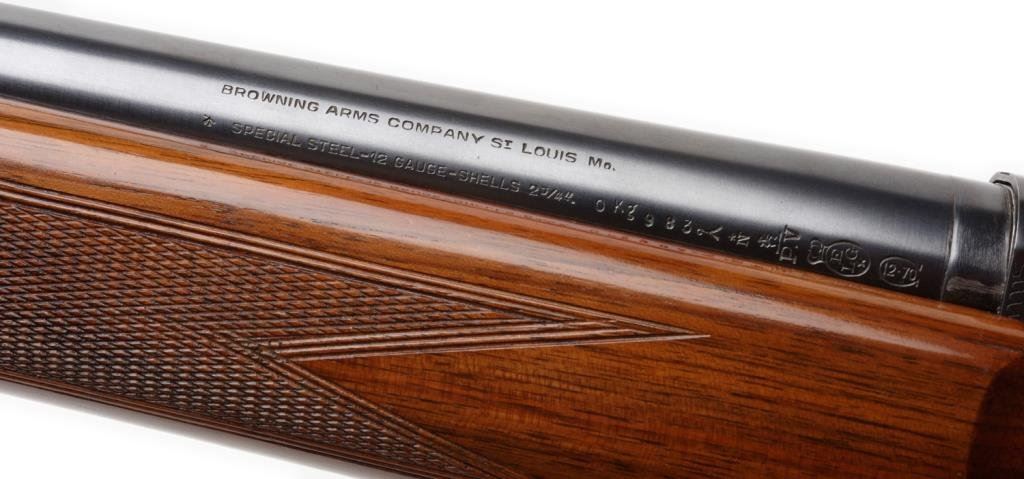 Browning 2 shot 12 GA semi-auto Belgium made shotgun, SN: 5643 with standard weight blued frame (Non-Alloy). 30” non-rib BBL. The stock measures 14 ½” to rubber pad with fitting marks to the wood. 96%-98% blue. Fine bore and action. Wood near fine other than mentioned poor work to pad area by a amateur. Fix the butt plate to have a very nice early 2 shot with standard frame. Est.: $500-$1000