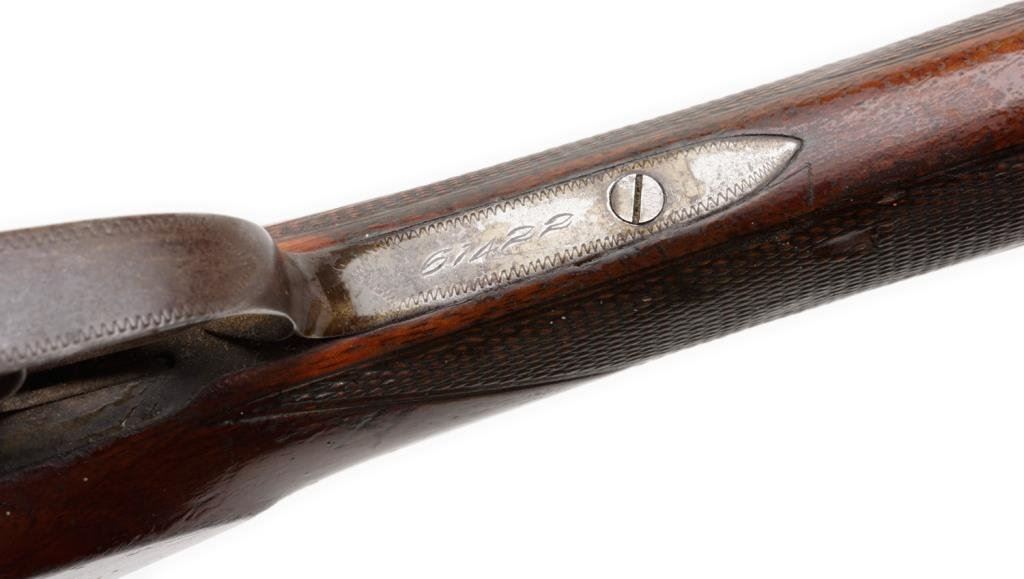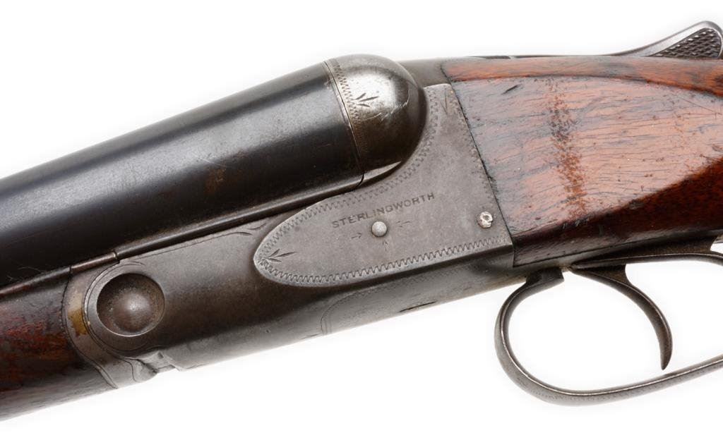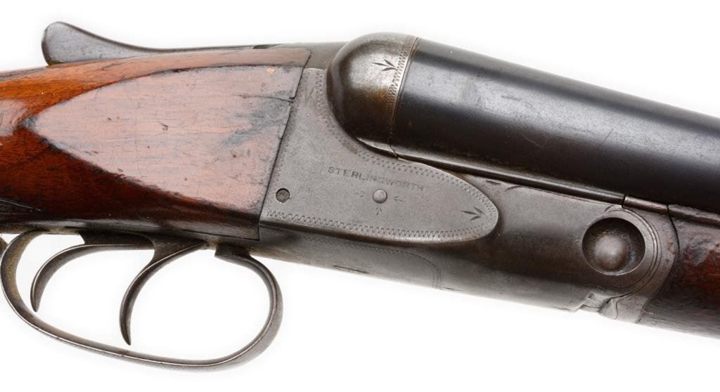 A.M. Fox “Sterlingworth” SxS shotgun in 12 GA with 30” BBL’s, auto ejectors, double triggers, English style straight stock, SN: 61422. Just out of storage and from an estate, there are still cobwebs in the BBLs!! 80%-90% blue, traces of case going to patina and dull. The stocks are sound with old re-varnish or shellac (no sanding). The butt pad has melted. The gun is choked full and full. The bores are bright and will clean also. Locks like a bank vault. Measures 14 5/8” to the end of the wood. This fox would restore nicely and cheaply. Est.:$500-$1000
