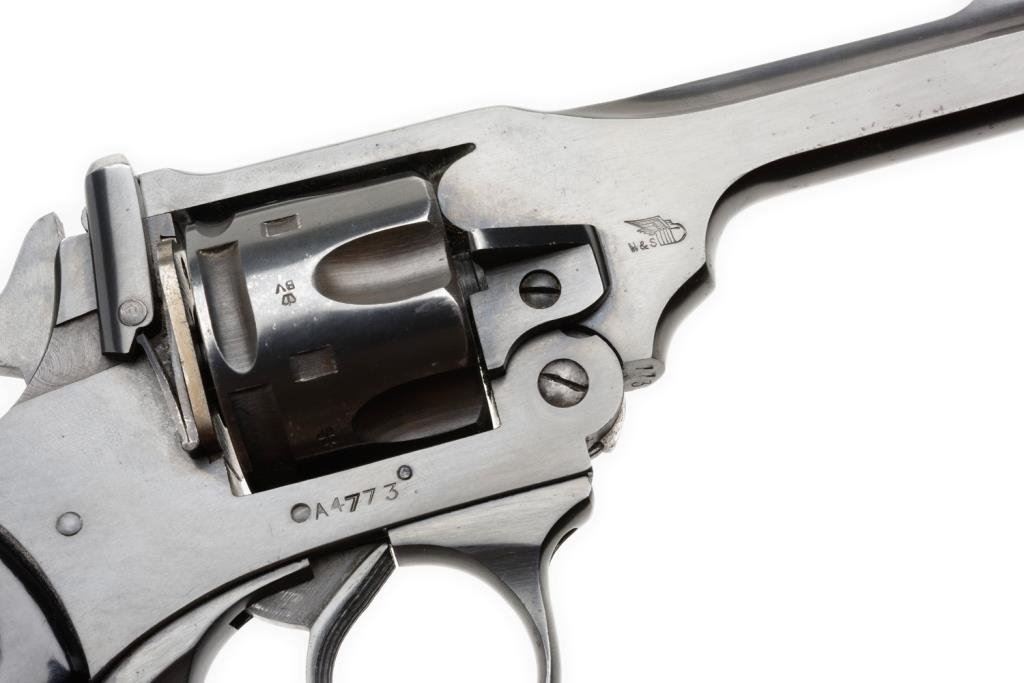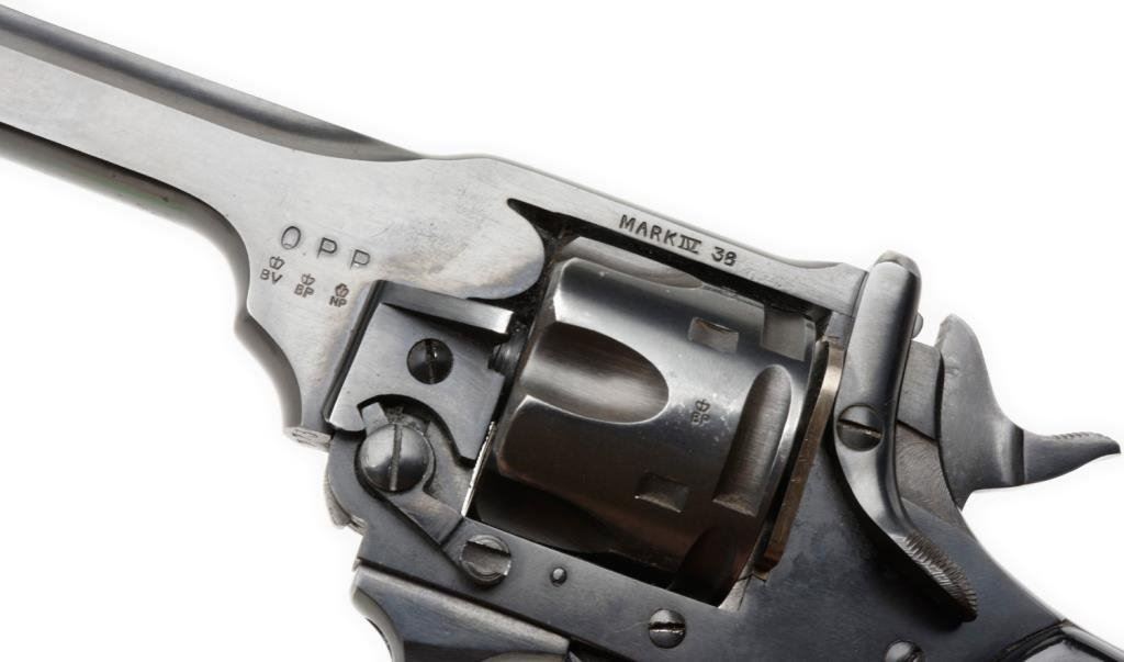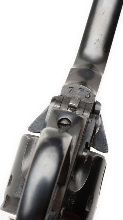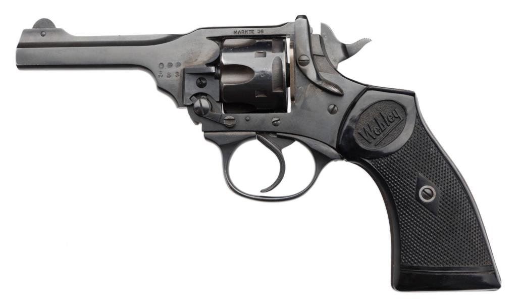 Webley MK IV double action .38 caliber revolver with commercial blue finish and police markings, SN: A4773. Shows Webley bullet mark on the right BBL lug. Also address on top of the frame, “Webley and Scott.” Stamped “O.P.P. on the left BBL lug. Full compliment of BP proofs, with a 4” BBL. No import marks. 95%-98% blue with near excellent composite grips. Bright bore. Unusual. Est.: $400-$800