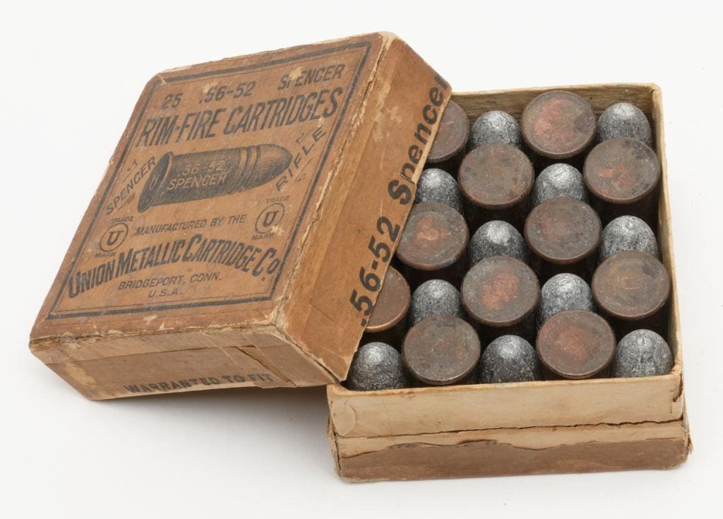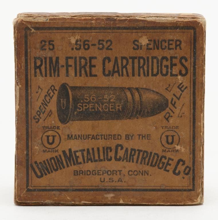 Full box of 56-52 Spencer cartridges (25), brown and black label in very good condition; cellophane wrapped. Est.: $200-$400.