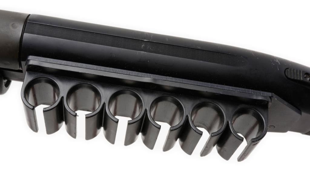 *Mossberg Model 590 pump action shotgun, 12 gauge, 21” barrel with ventilated hand guard, S/N J847650, black finish, composite stocks, hard rubber 6-round attachment to left side of frame; in overall good to very good condition with a near fine bore, tight action, majority of finish and good Davis Industries replacement combat butt stock. Est.: $200-$400.