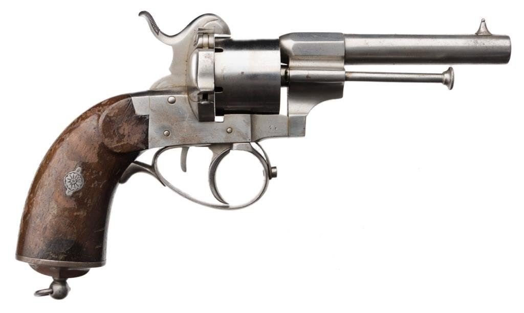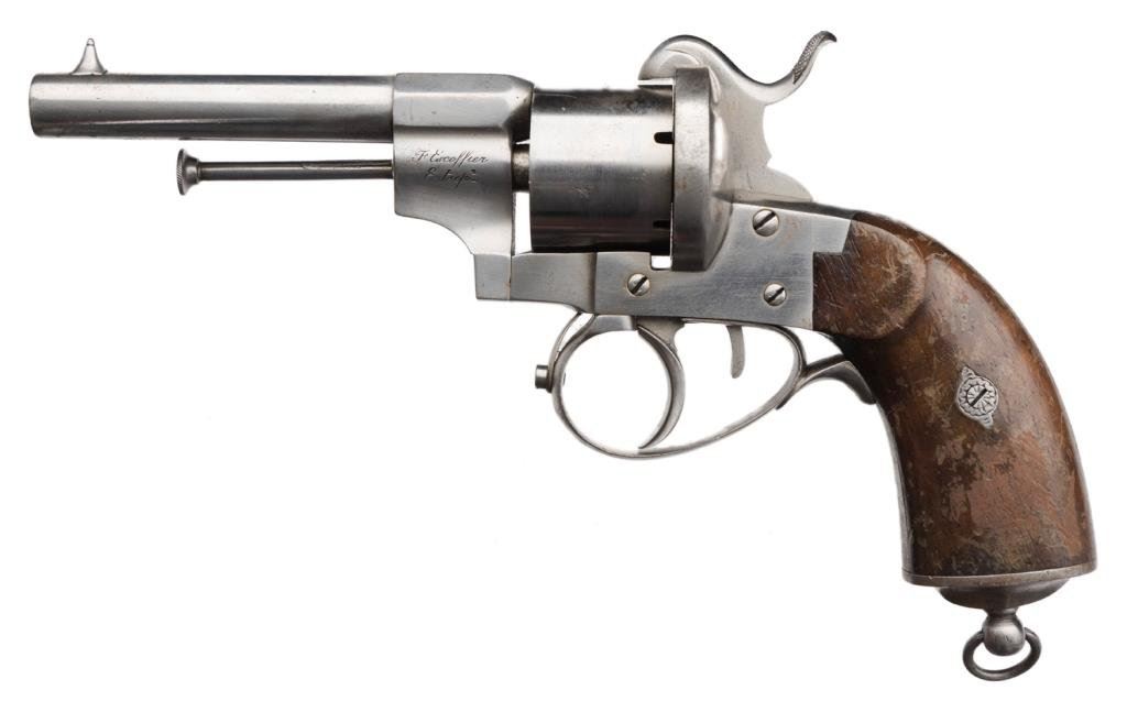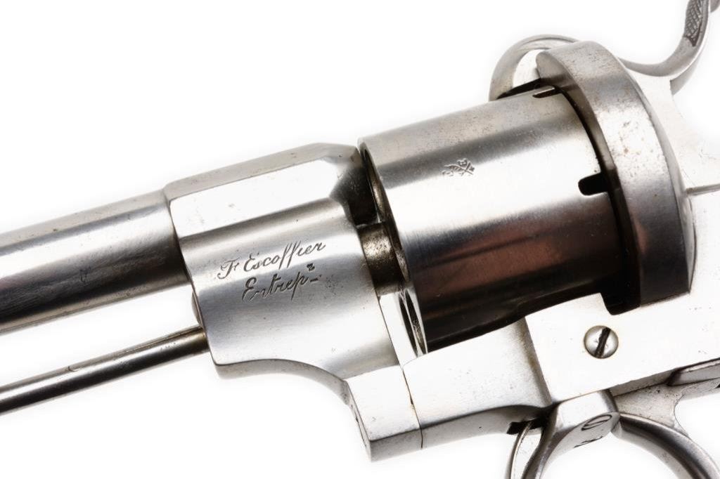 F. Escoffier experimental triple action revolver, single, half cock and DA; approximately 8mm caliber, 4” barrel, bright finish, wood grips, near fine condition with crisp action and some scattered loss to finish on grips. Est.: $600-$1,200.