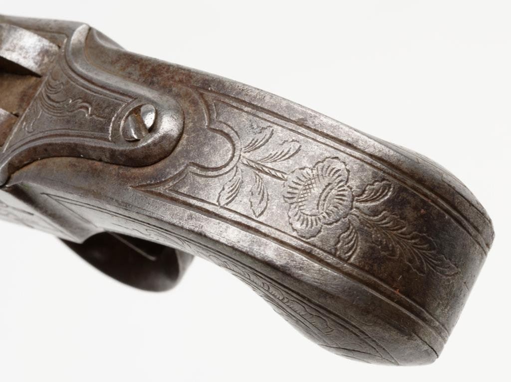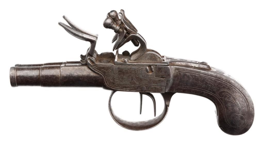 All metal 18th Century flintlock side by side double barrel pocket pistol of Central European manufacture, 9mm caliber, 2.5” barrels, engraved frame, good actions, pleasing patina. Est.: $600-$1,200.