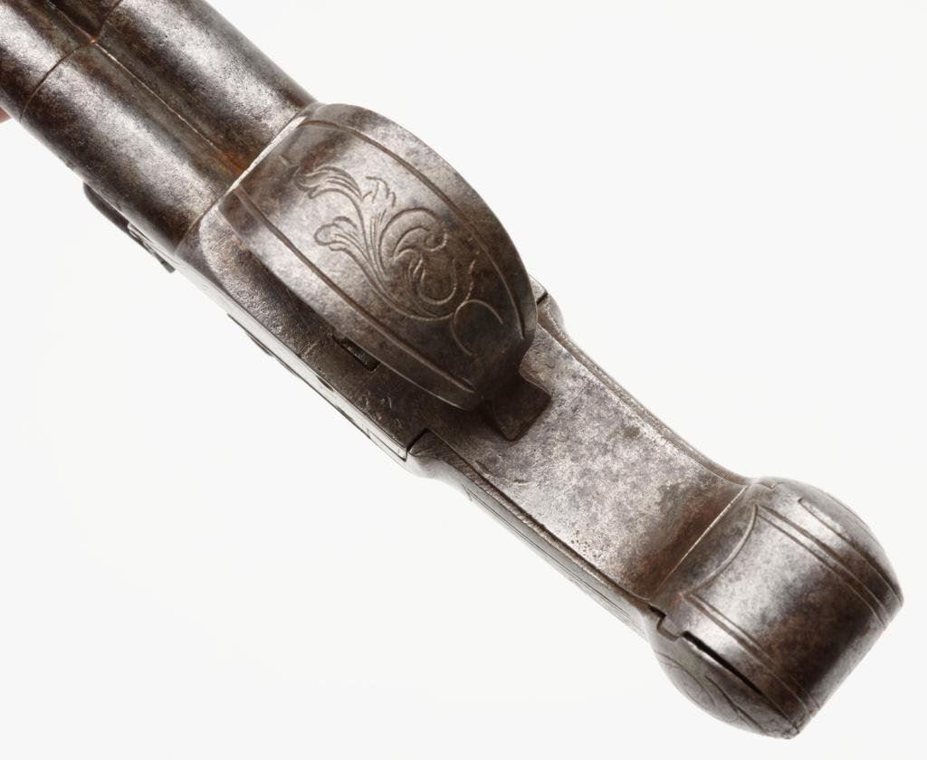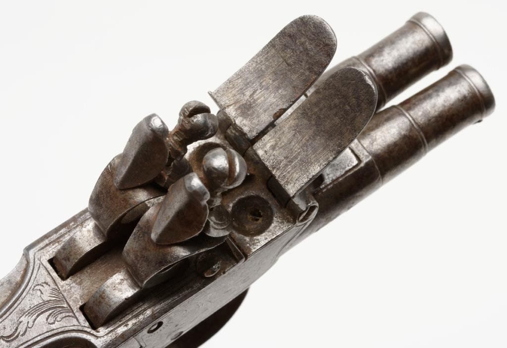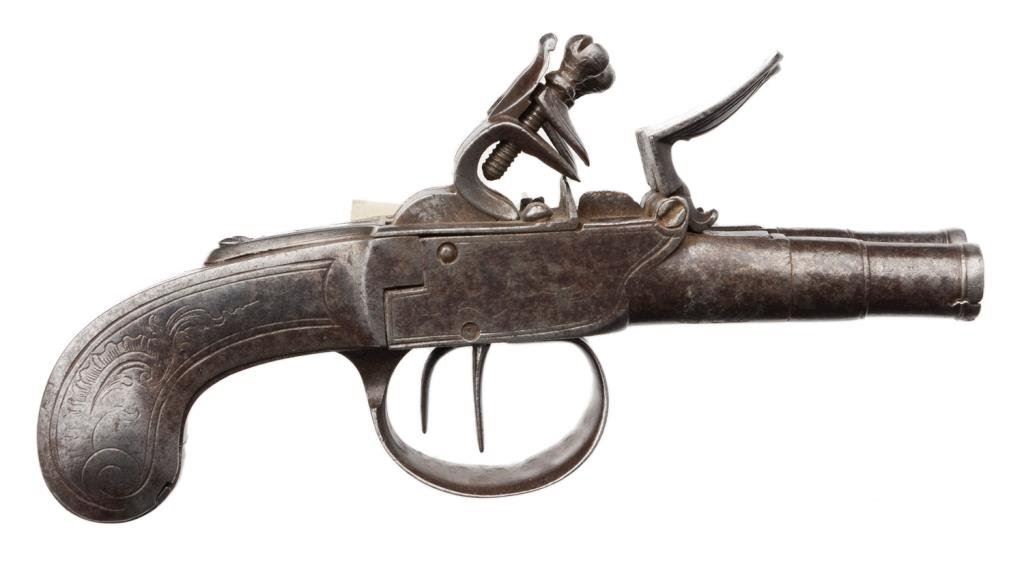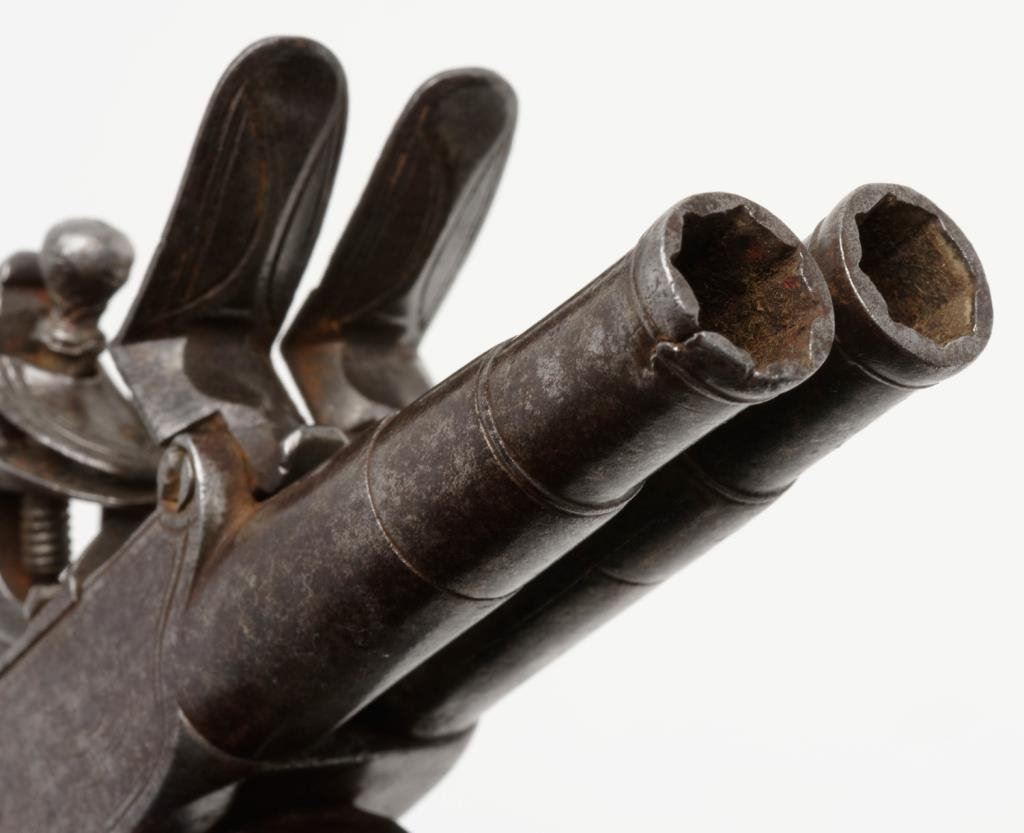 Lot 1759 All metal 18th Century flintlock side by side double barrel pocket pistol