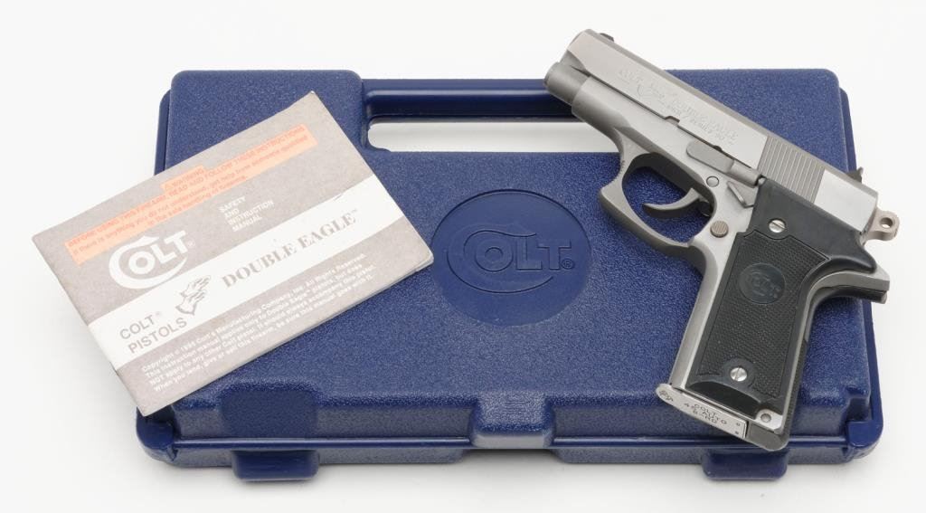 *Colt Double Eagle MK II Series 90 DA semi-automatic pistol, .45 caliber, 3.5” barrel, S/N DF07221, stainless with checkered black grips in fine condition showing minimal use; accompanied by a blue Colt hard carry case and instruction. Est.: $500-$1,000.