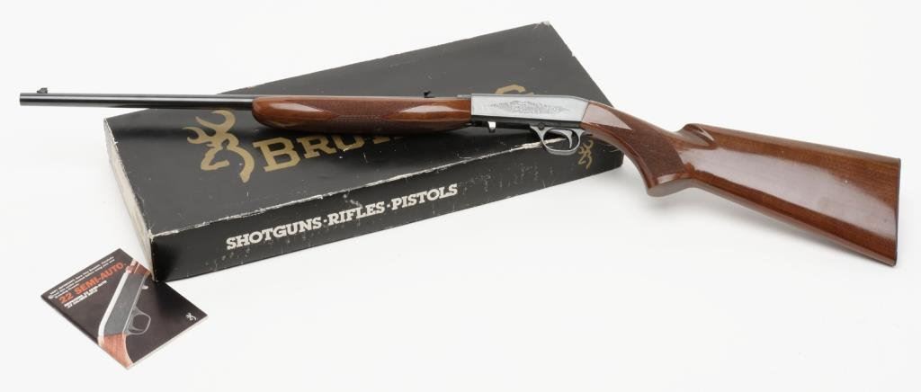 *Browning ATD semi-automatic rifle, .22LR caliber, 19.25” barrel, S/N 06550PN146, blued finish, checkered wood stocks in like new condition with factory two piece cardboard box and inserts. Est.: $350-$700.