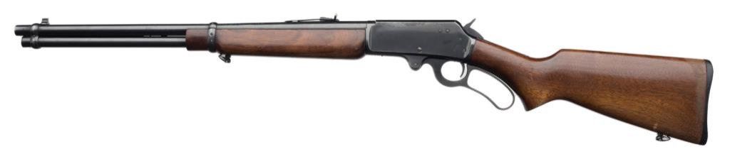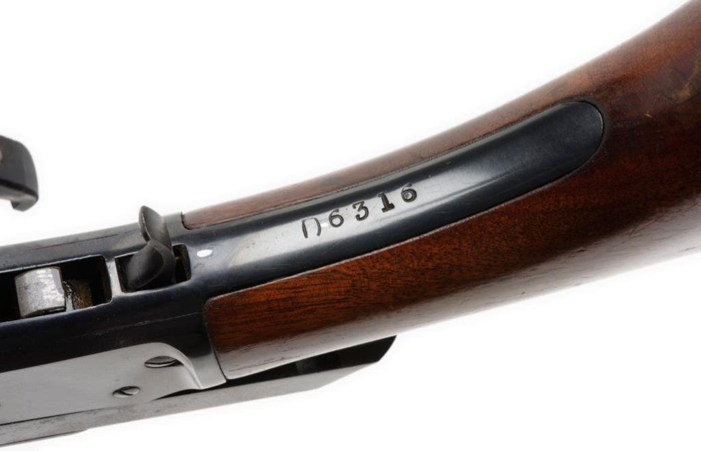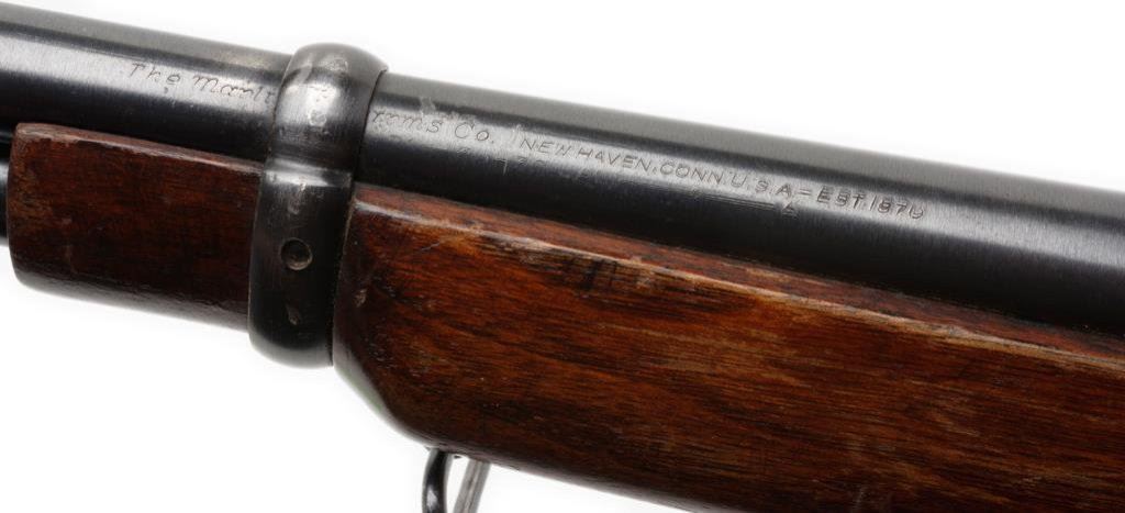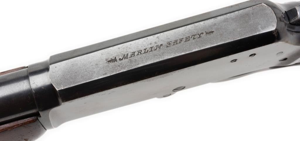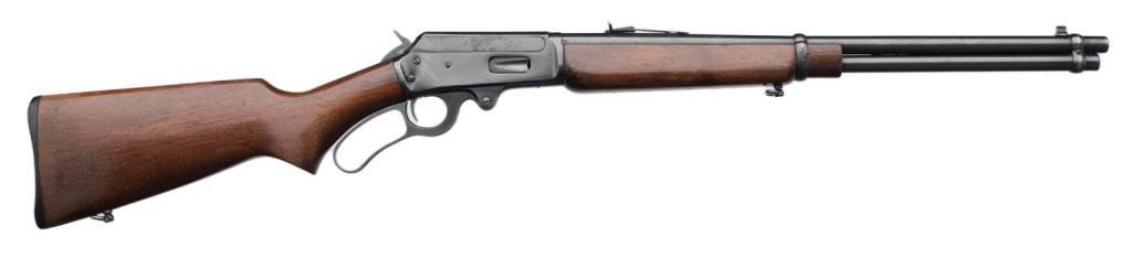 *Marlin Model 36 lever action carbine, 30-30 cal., serial #D6316. The carbine is in overall very good condition with a 20” blued barrel. The barrel and full-length magazine retain nearly all of their blued finish with a loss of finish at the barrel bands. The receiver is marked, “Marlin Safety” on top and retains the majority of its blued finish with some light surface rust evident. The smooth wood stocks are in overall very good condition with moderate wear consisting of mars, scratches and compressions consistent with use. The butt stock ends with a hard plastic, Marlin marked butt plate and sling swivels have been added. The bore is very good, the action crisp and the markings are sharp. Est.: $400-$600.