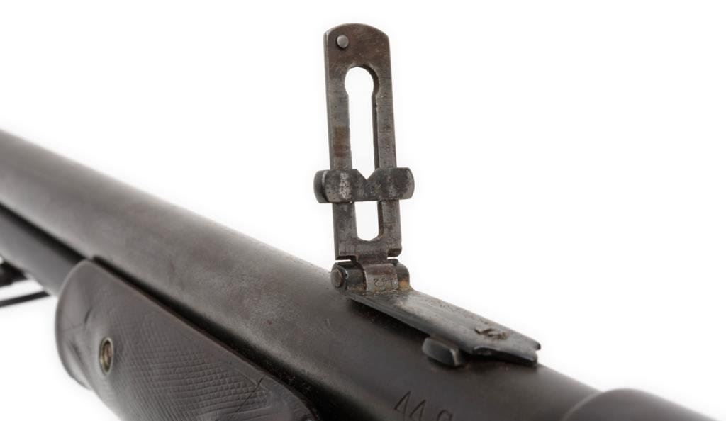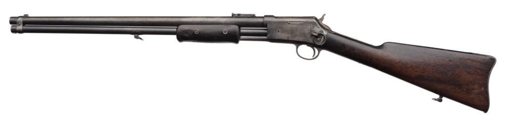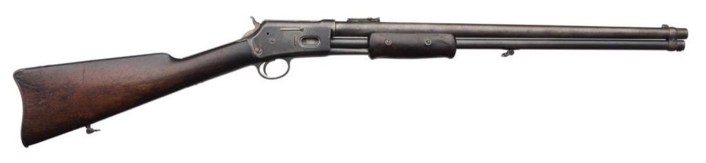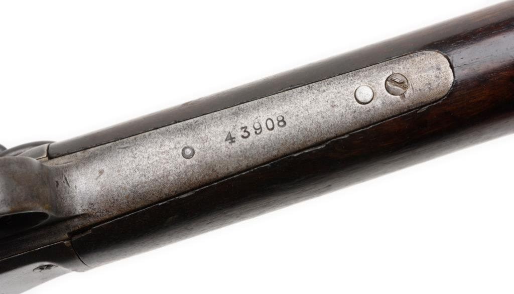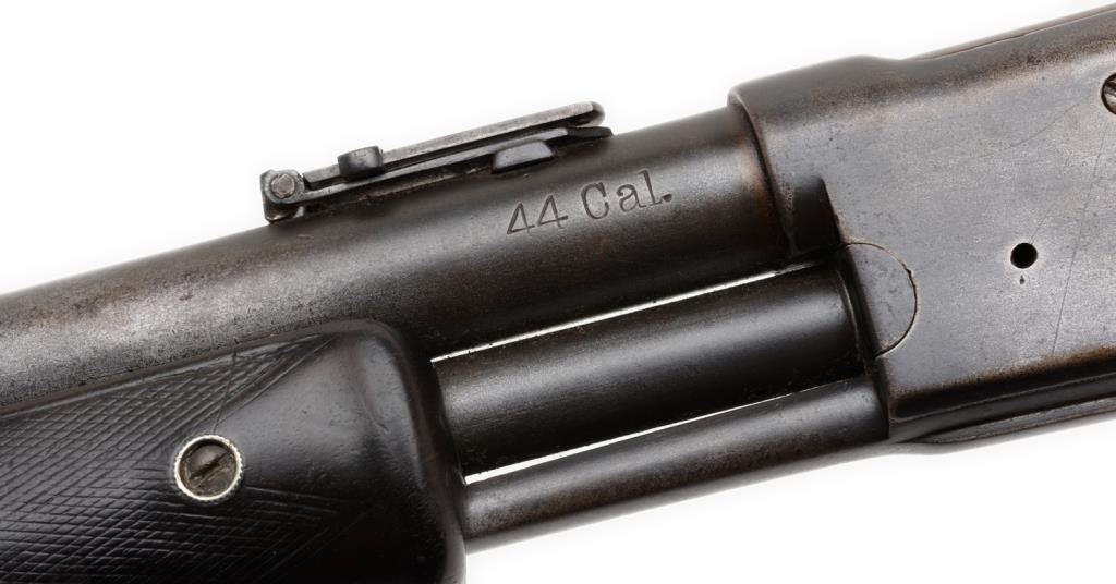 Scarce Colt Lightning pump action carbine with saddle ring, .44-40 caliber, 20.5” round barrel, S/N 43908, blued finish, wood butt stock with checkered wood forend; period swivels added at time of use; tight action, good wood; rough bore that may clean; original carbine sight. Est.: $1,400-$2,800.