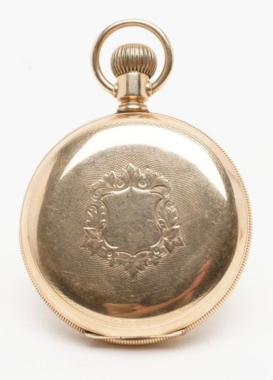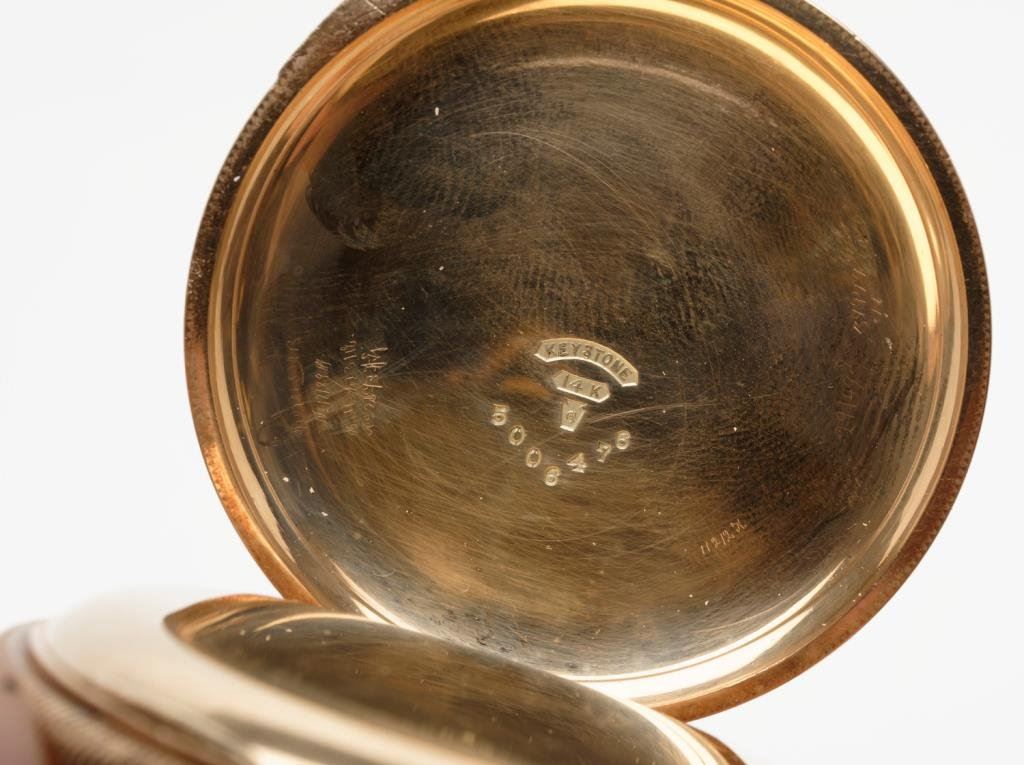 E. Howard & Co. Boston pocket watch in 14 keystone marked hunting case. Movement #224911 with Hound mark and Howard signature. Case #5006476, Needs crystal. Running. Est.: $600-$1200