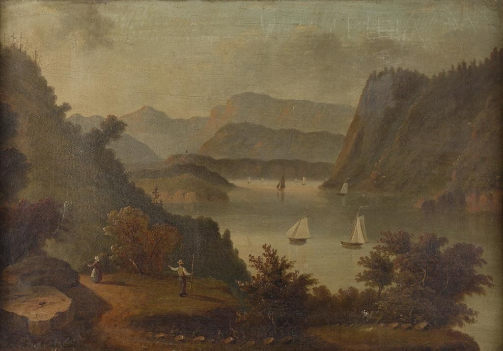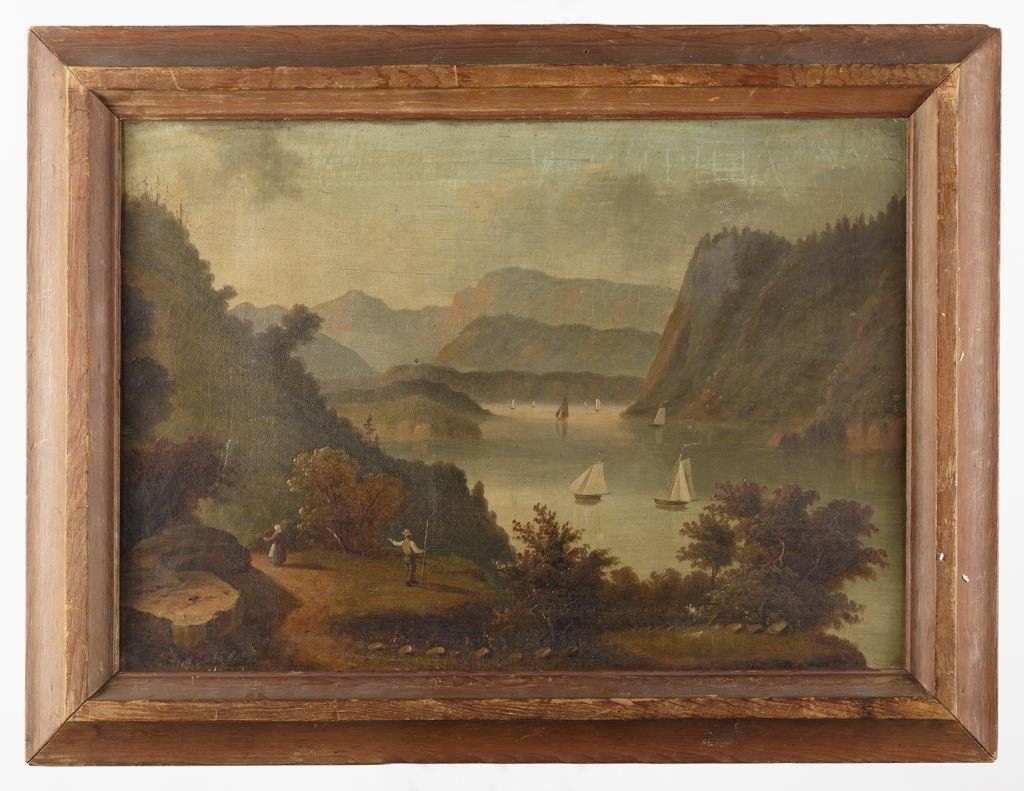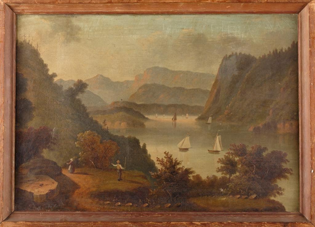 Lot 1800 Hudson River Valley School oil on canvas showing sailing ship, fisherman a