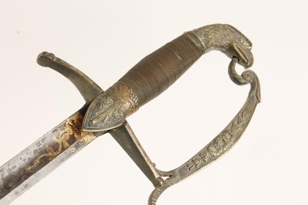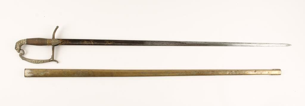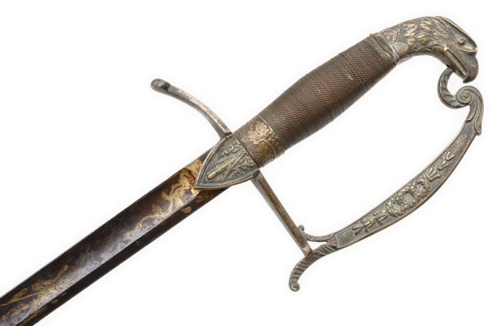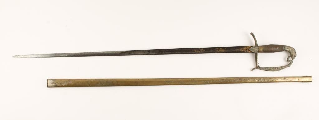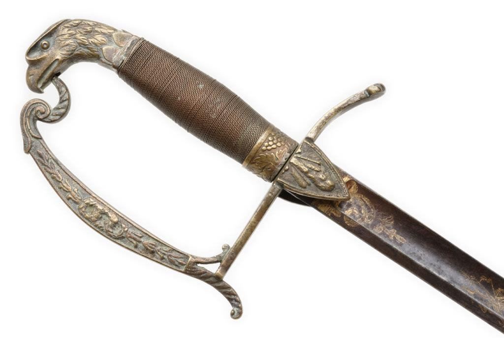 Pre-1835 Eagle Head U.S. Officer’s sword with engraved brass scabbard; considerable muted niter blue finish with gold washed designs on blade; overall good condition. Est.: $600-$1,200.