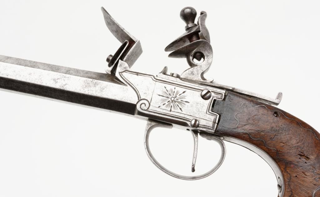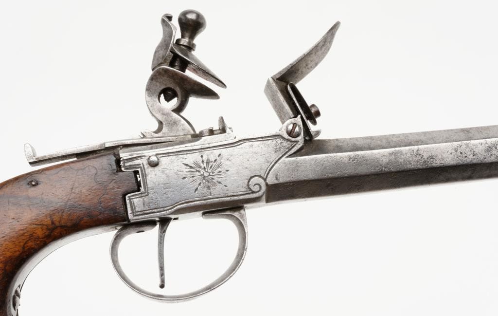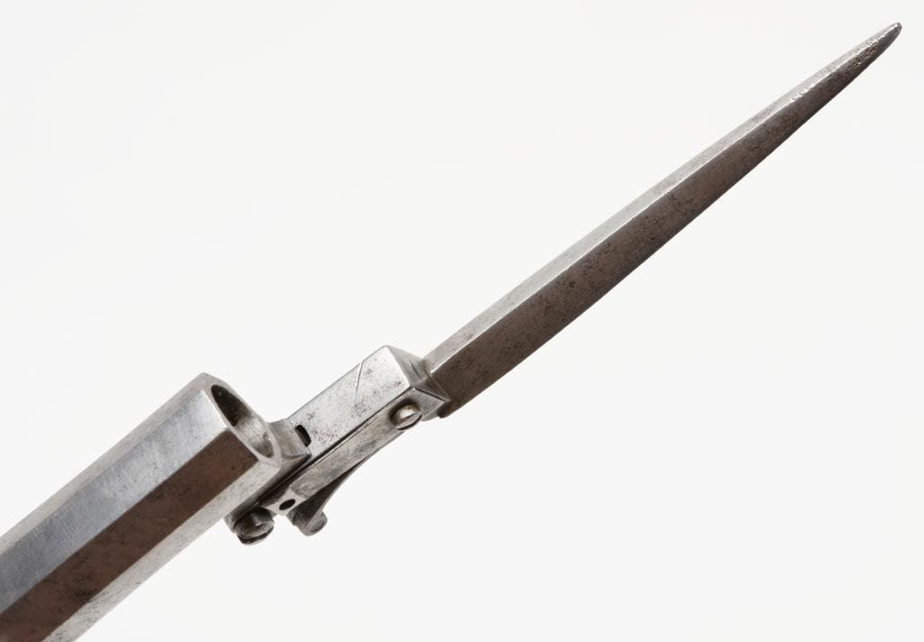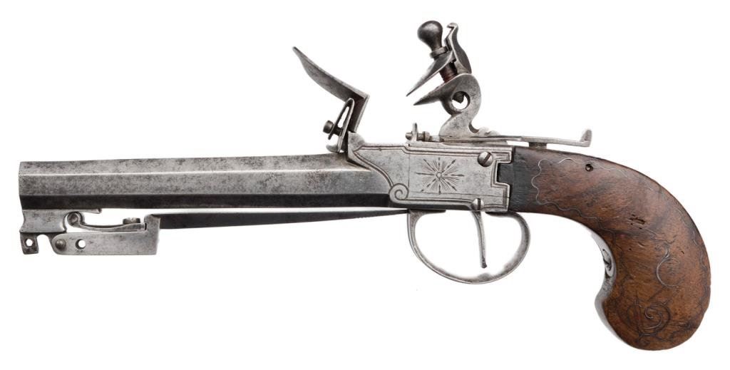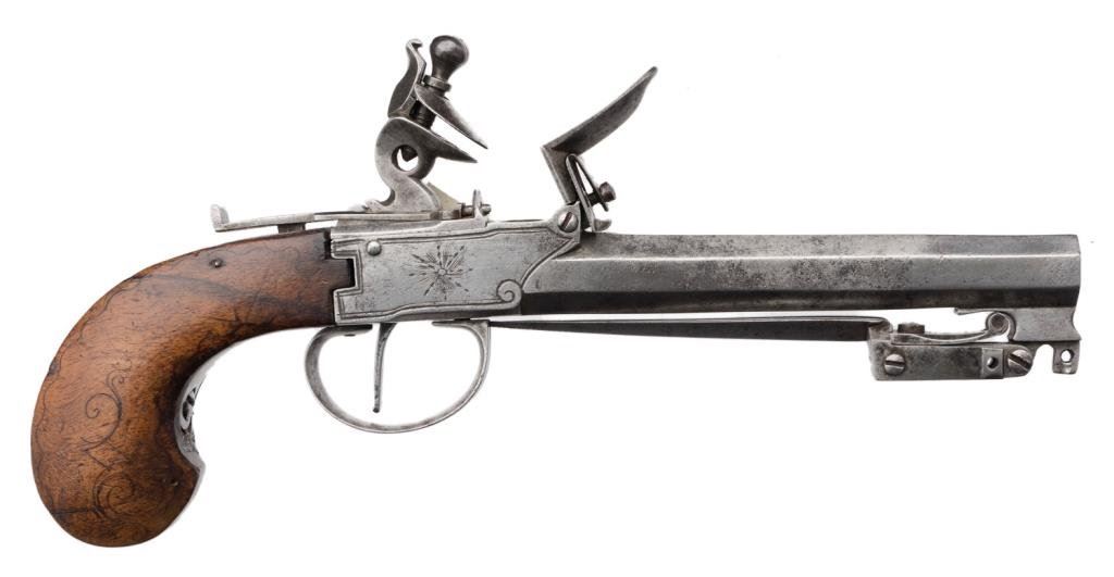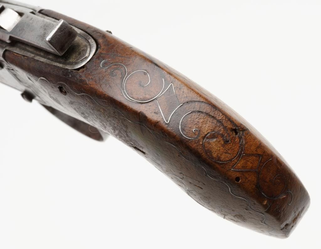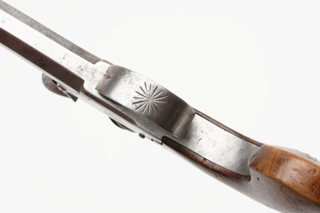 High quality DA pinfire revolver with etched “Le Page” address on barrel; 7.65mm caliber, 3.25” barrel, S/N 334, wood grips; overall very good to near fine condition. Est.: $500-$1,000.