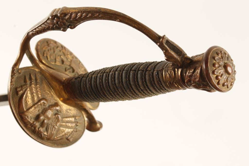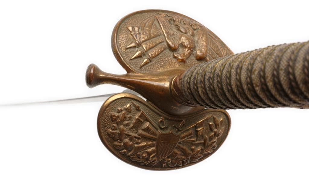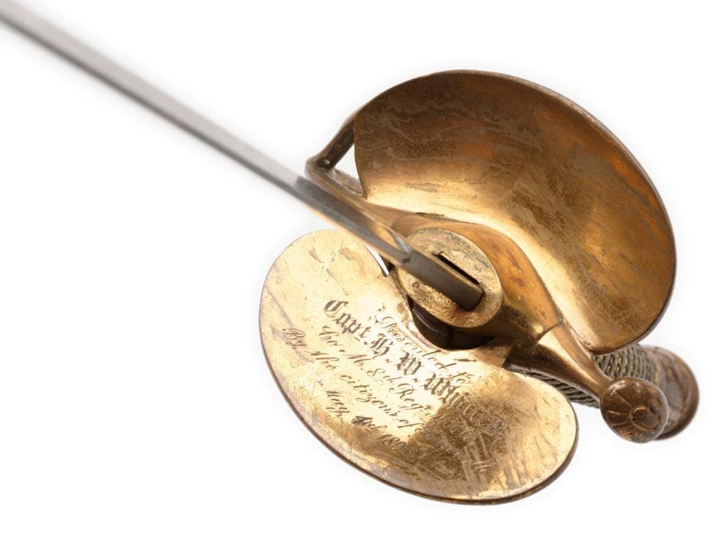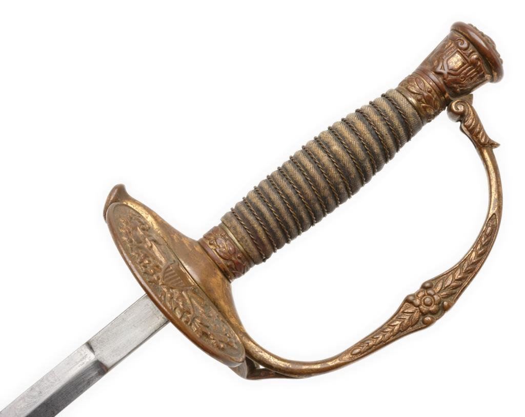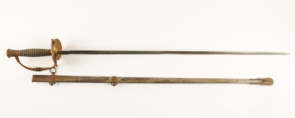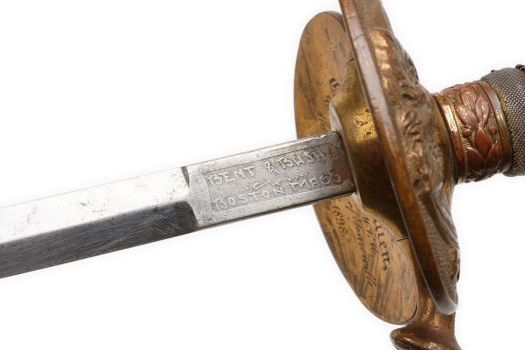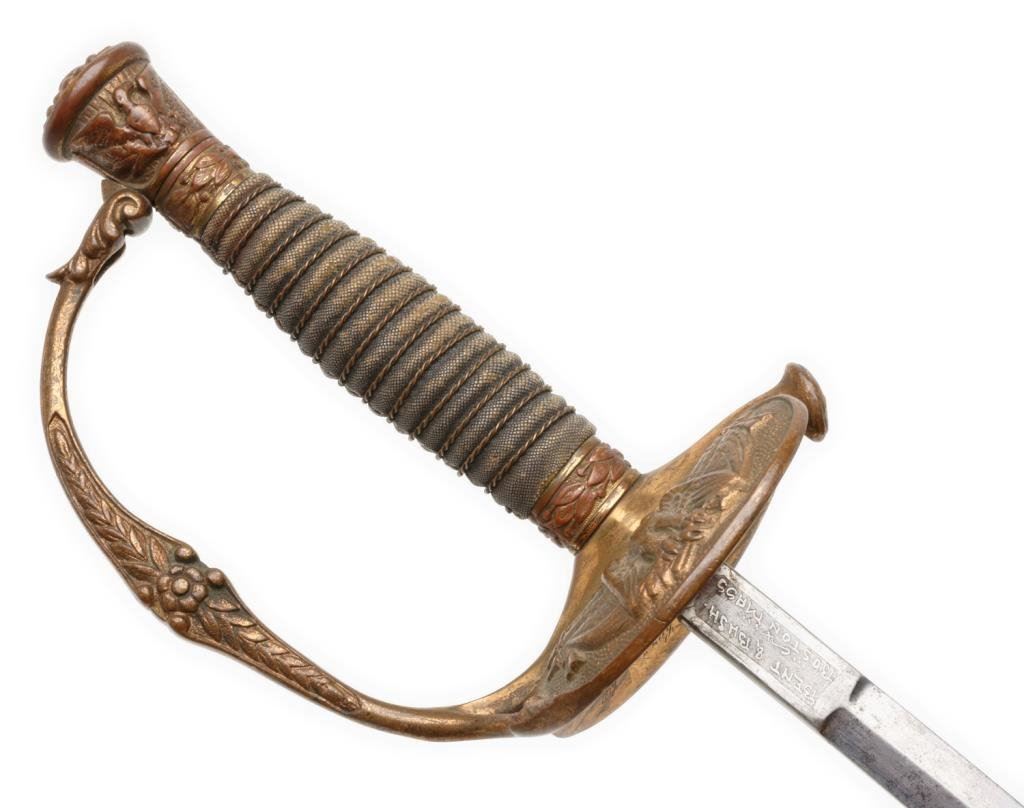 Late manufacture 1860 Staff & Field Officer’s pattern sword by Bent and Bush, Boston, with metal scabbard; Inscribed on inside of guard “Presented to Cap’t H. W. Witten, Co. M, 8th Reg’t M.V.M by the Citizens of Somerville, 1898”; very good condition overall. Est.: $500-$1,000.