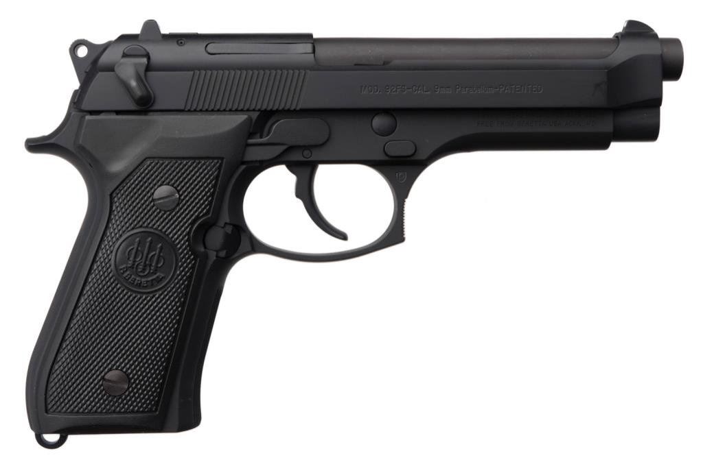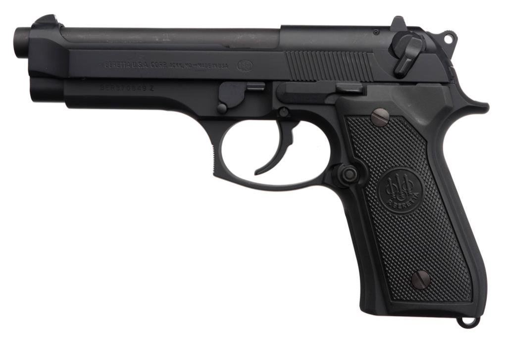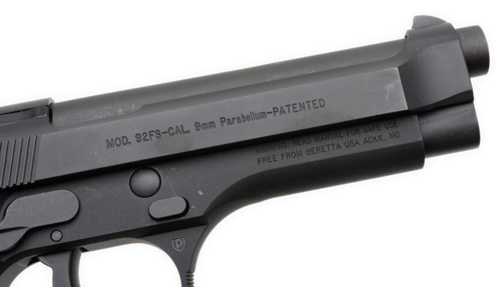 *Beretta Model 92 FS semi-automatic pistol, 9mm cal., serial #BER370849Z. The pistol is in overall excellent condition showing only light handling marks. The pistol retains nearly all of its blued finish with a 4 5/8” barrel, ramp front and fixed rear sights. The Beretta marked checkered plastic grips are in excellent condition as well showing little use. The bore is excellent, action crisp and markings sharp. The serial number of this pistol is consecutive to Lot #2050. No magazine is included with this pistol. Est.: $400-$800.