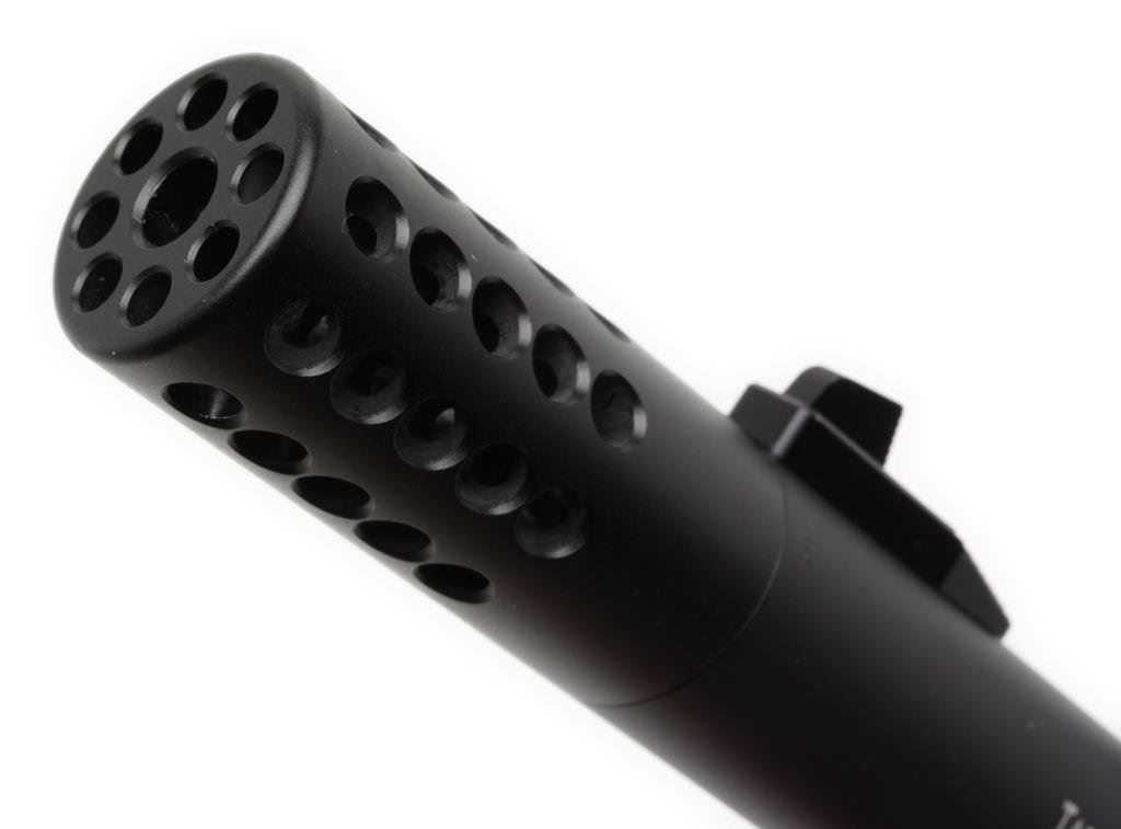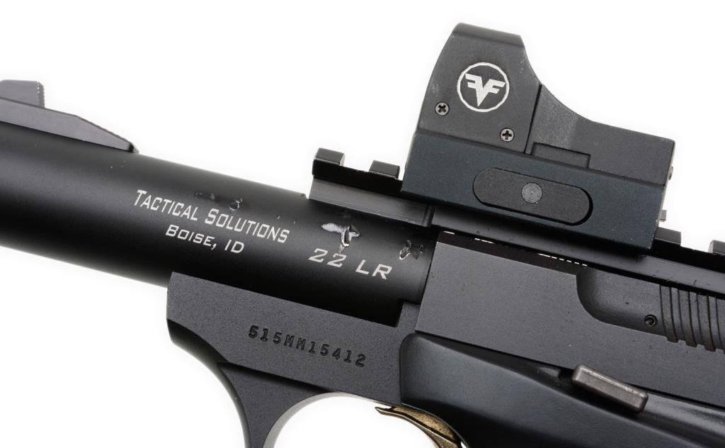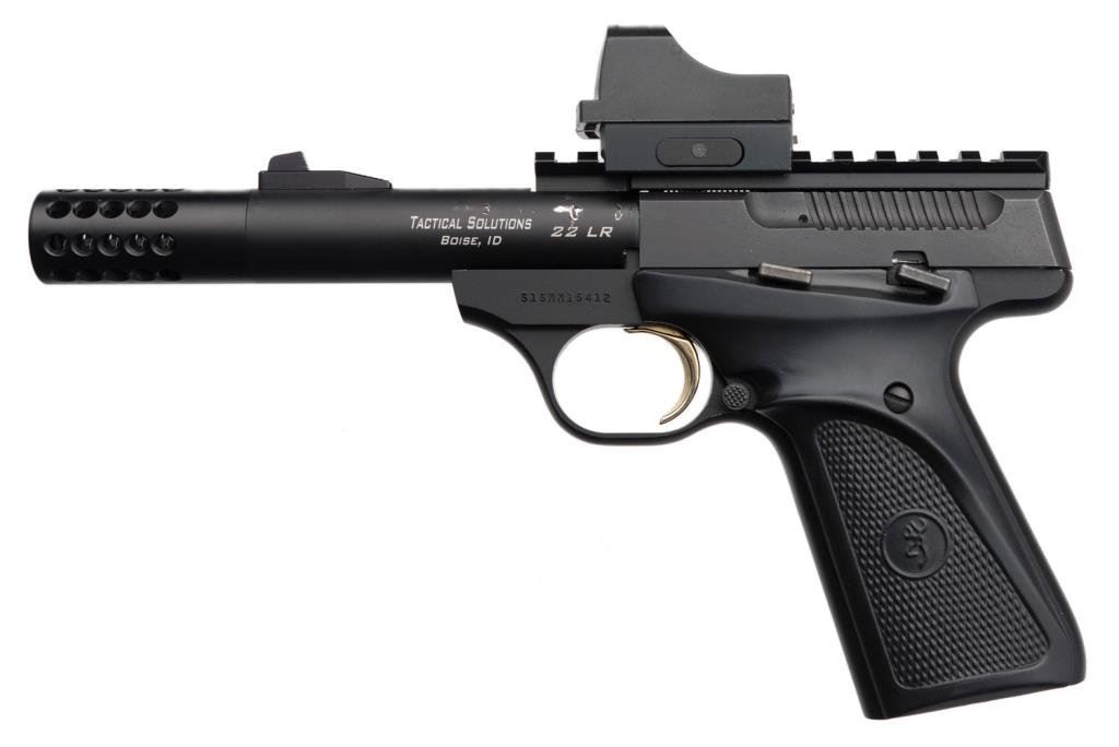 Browning Buckmark semi-automatic pistol, .22 Long Rifle cal., serial #515NN154412. The pistol is in overall very good condition as customized. The pistol has a 5 5/8” aftermarket “Tactical Solutions” barrel with muzzle break. The barrel shows some loss of finish on the right side. Additionally, a scope mount rail has been added and a holographic sight has been added. The checkered plastic Browning grips are in overall very good condition. No magazine is included with the pistol. The bore is very good, the action crisp and markings are legible on this highly customized Browning. Est.: $400-$800.