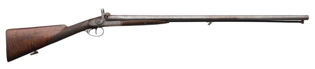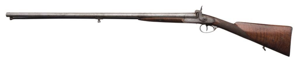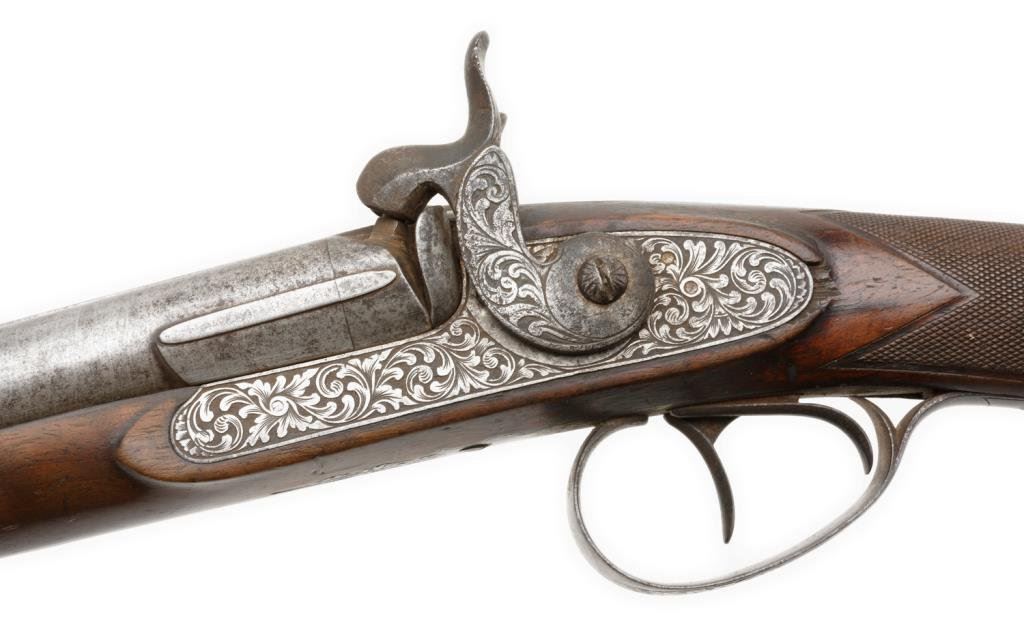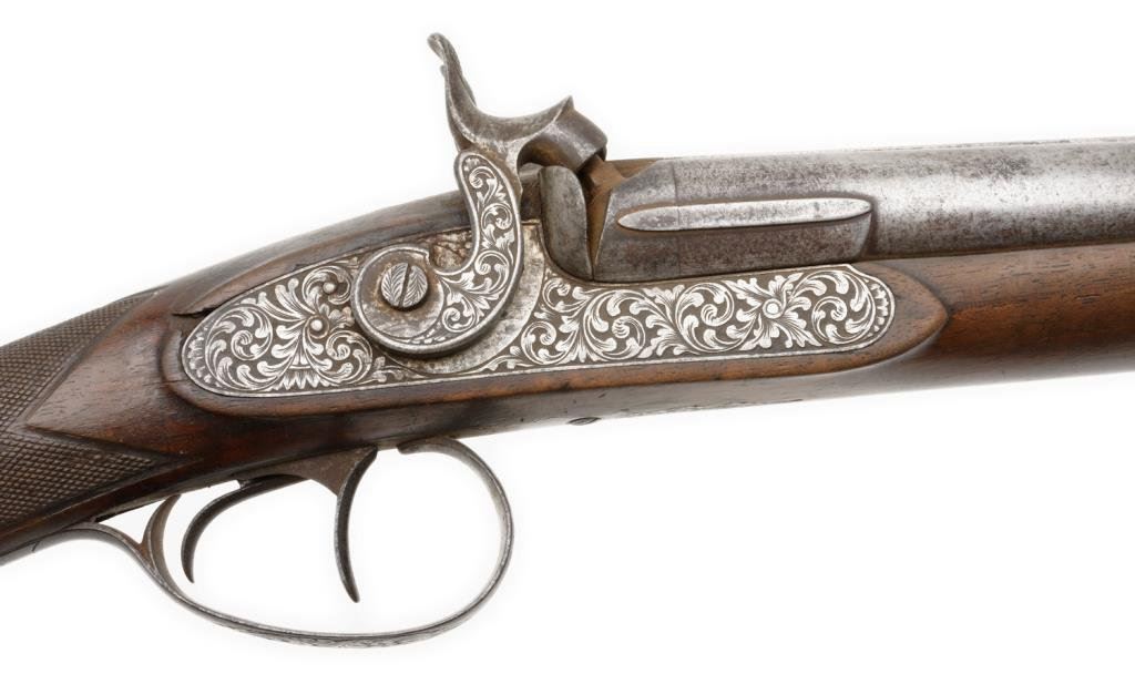 Double barrel side by side percussion shotgun with ornate engraving on receiver and hammers; 16 gauge, 31” barrels, checkered wood stock, sling swivels, ca 1850’s in overall good condition; no visible name, good actions, probably of French manufacture. Est.: $400-$800.