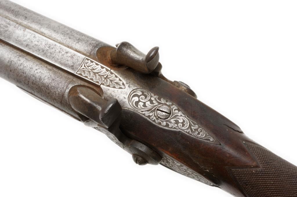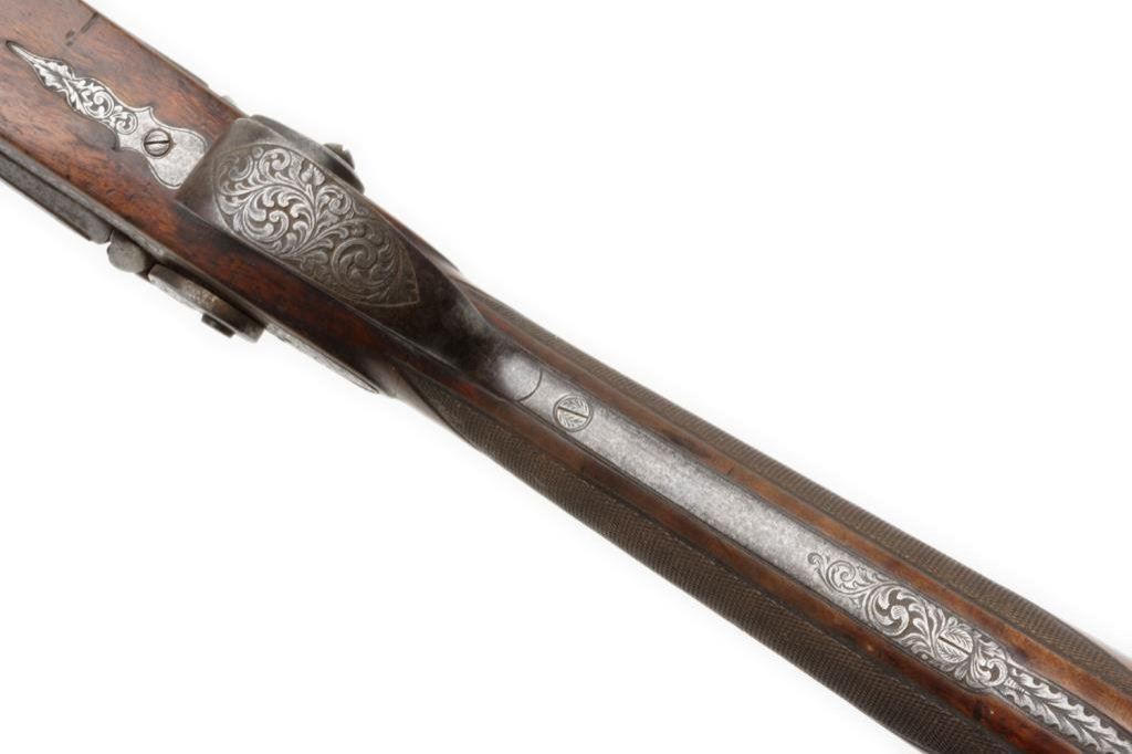 Lot 1829 Double barrel side by side percussion shotgun with ornate engraving on rec