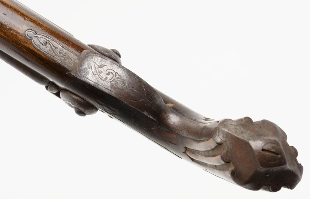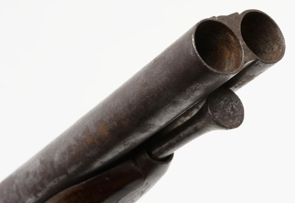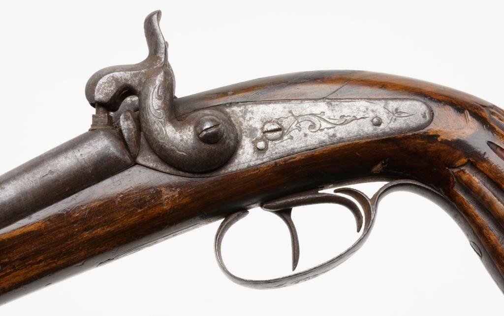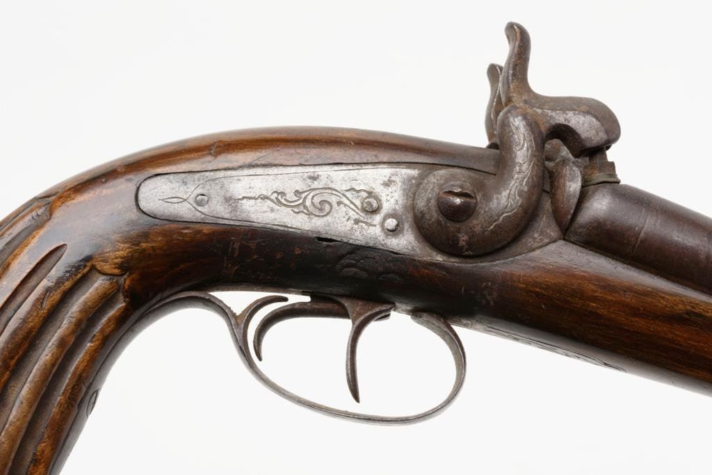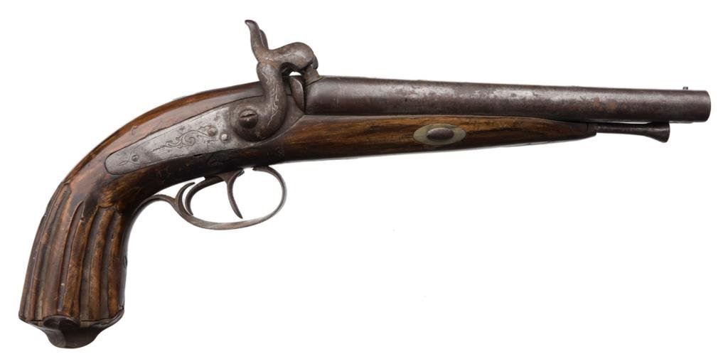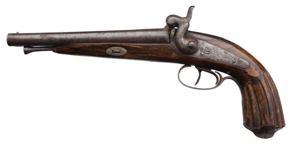 Side by side percussion pistol, .58 caliber, 8” barrels, wood stock, ca 1860’s-1870’s; overall fair to good condition. Est.: $400-$800.
