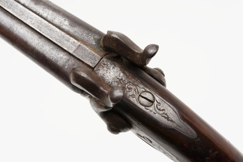 Lot 1833 Side by side percussion pistol, .58 caliber, 8” barrels, wood stock, ca 18