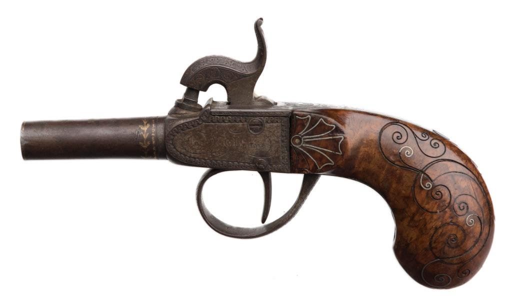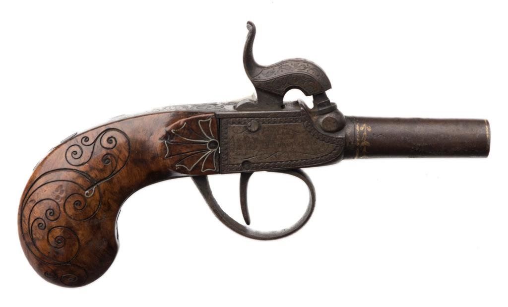 High quality mid 19th Century percussion pocket pistol signed L.N. Bonnefio in St. Etienne; engraved frame and hammer with gold on barrel; silver wire in burl wood stock that is also carved; dark patina, strong action. Est.: $400-$800.