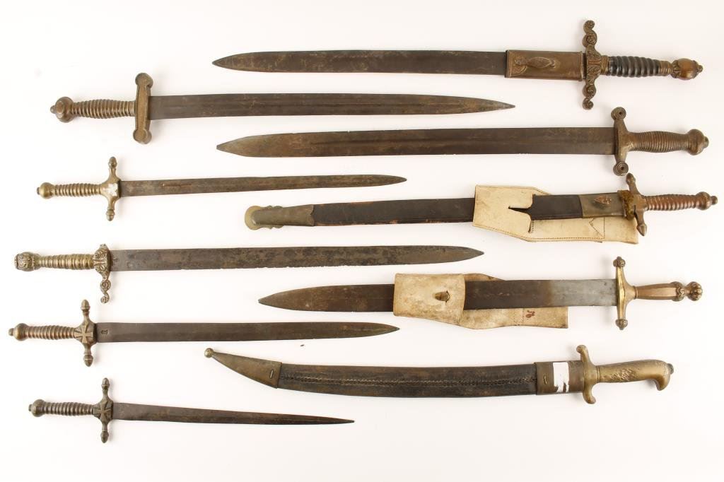 Lot of 19th to 20th Century early short swords; 10 total; 2 with sheaths. Est.: $400-$800.