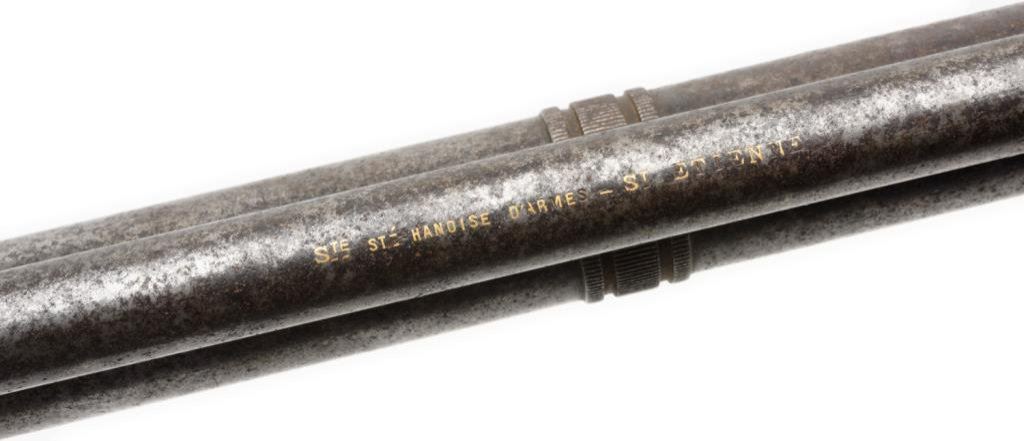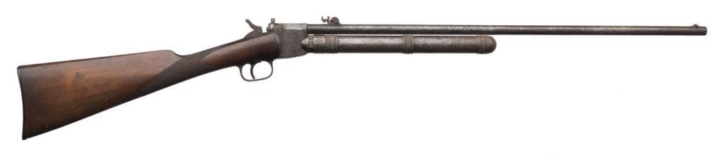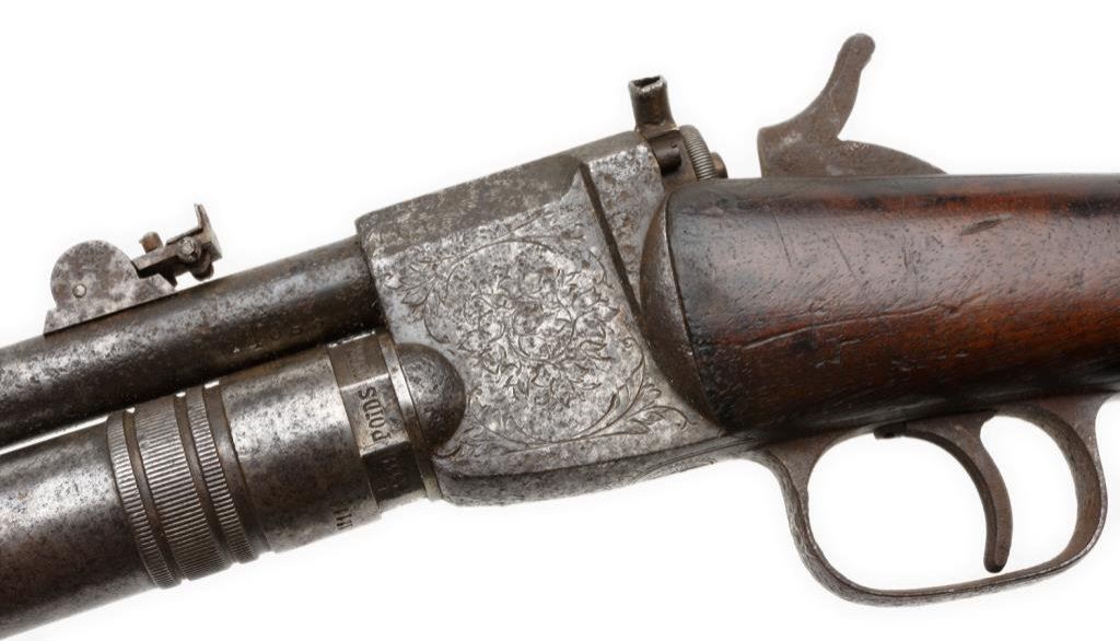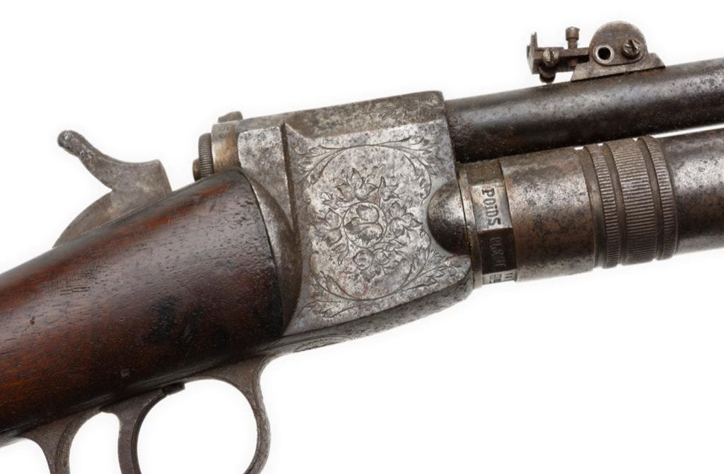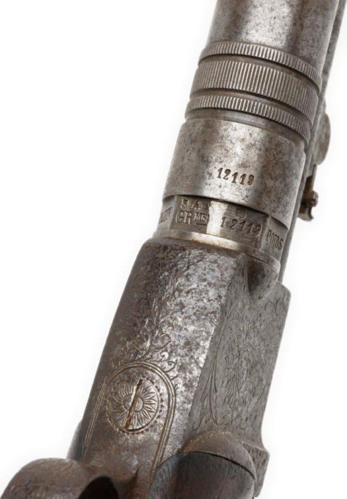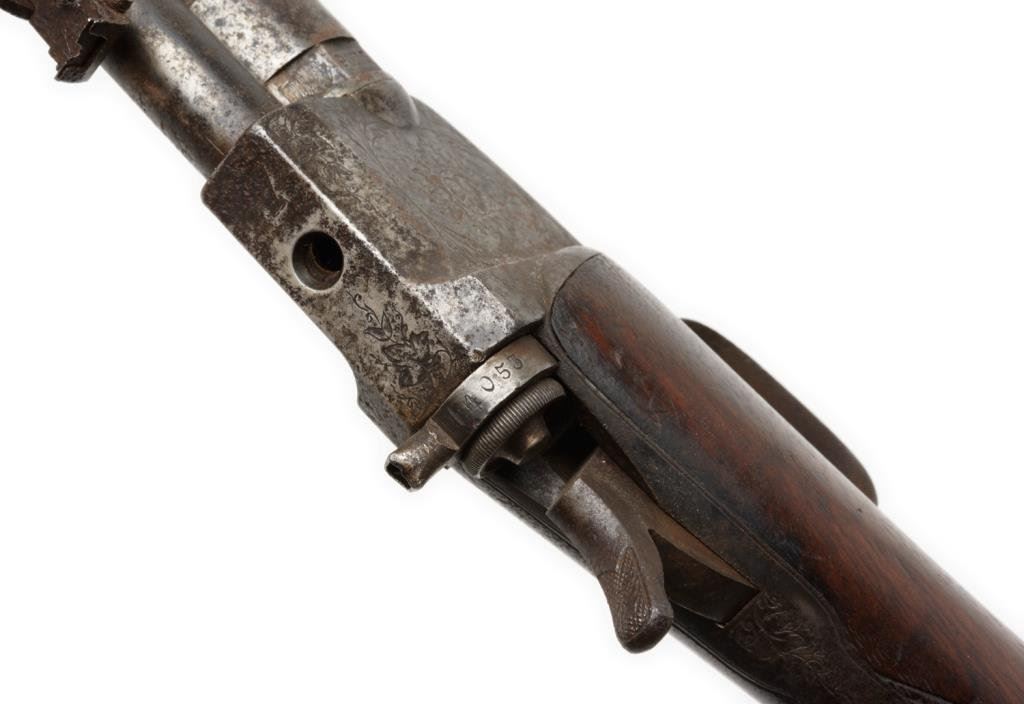 French Giffare air gun from the 19th Century, 41.5” overall with engraved frame and dark patina, S/N 12119; checkered wood stock; fair to good condition; no pump. Est.: $300-$600.