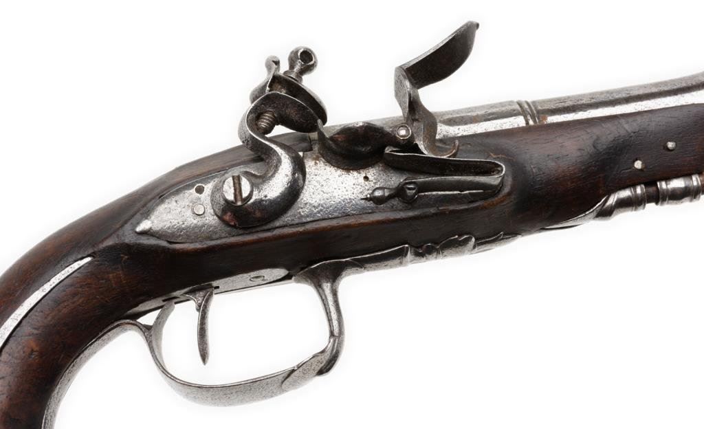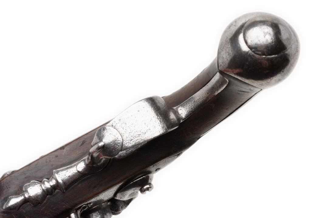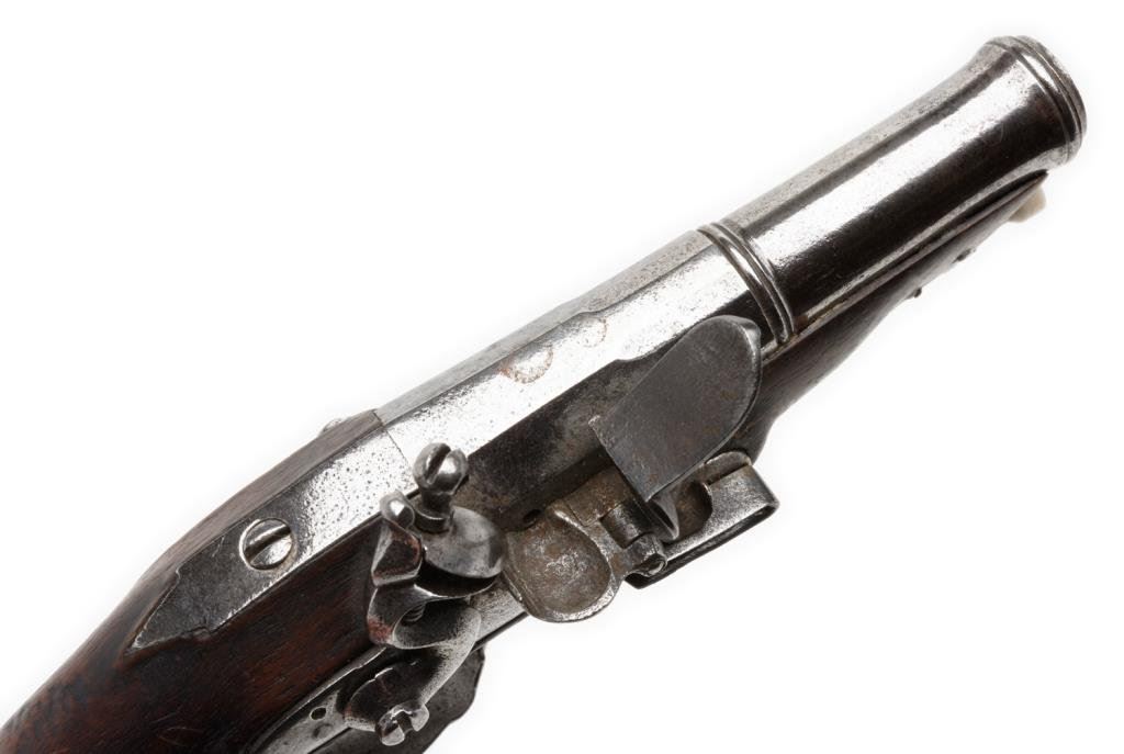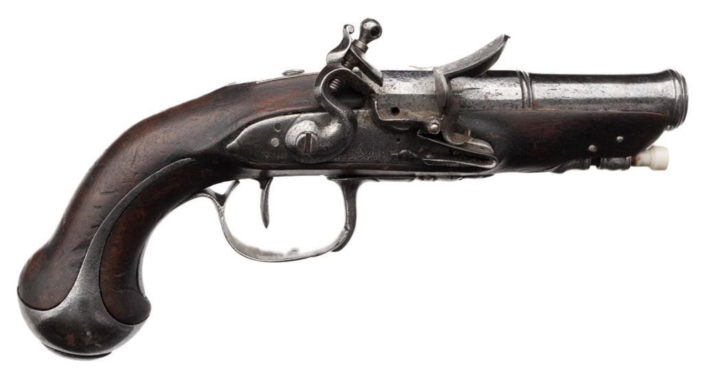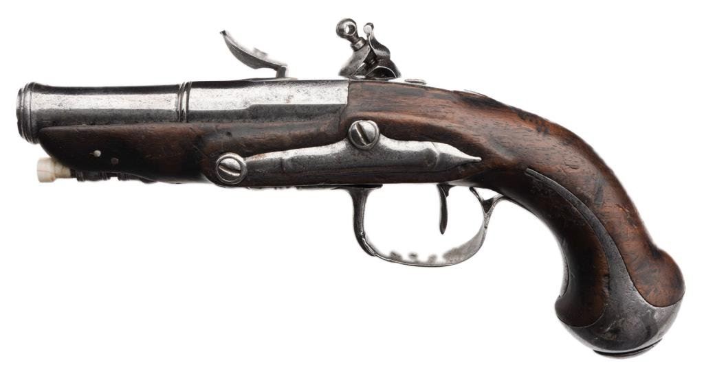 French flintlock pocket pistol, .52 caliber, 8” overall with a 3.75” barrel, good action, overall good condition, cleaned and polished metal surfaces. Est.: $300-$600.