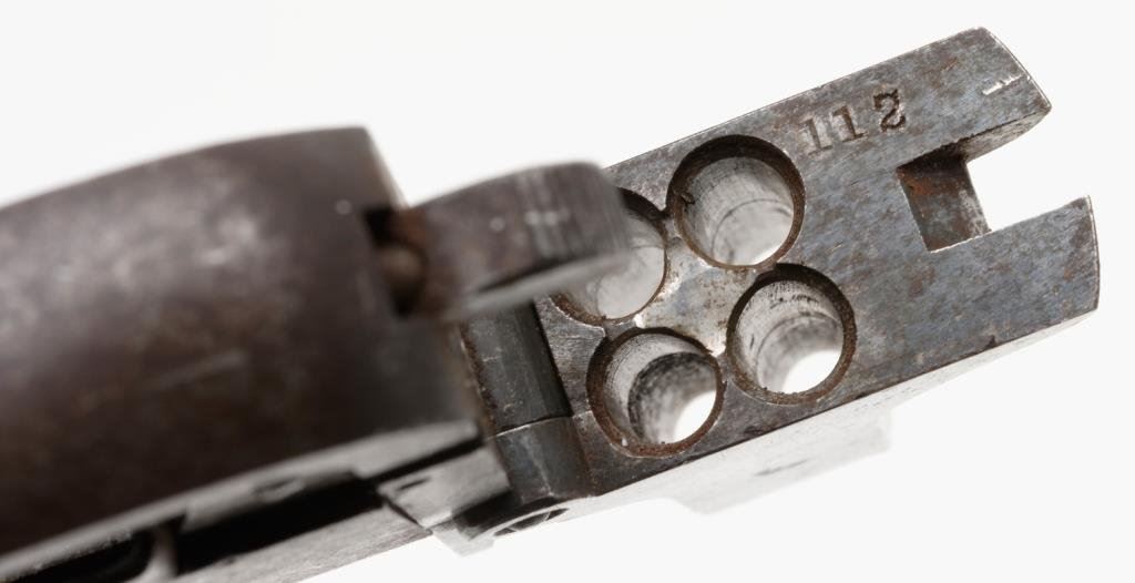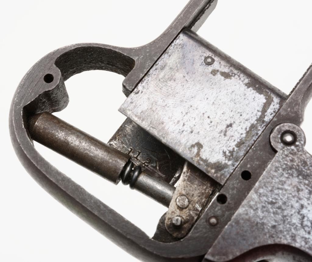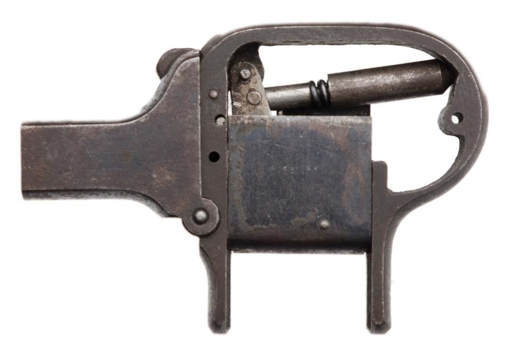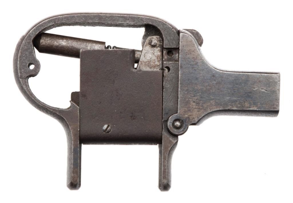 Shattuck palm pistol, .22 caliber, 4 barrel; blued finish; missing grips and some small parts. Est.: $300-$500.