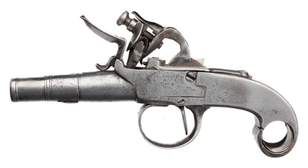 All metal flintlock pistol ca 18th Century with barrel key in butt; one of a pair originally; good action, hammer broken and repaired. Est.: $250-$500.