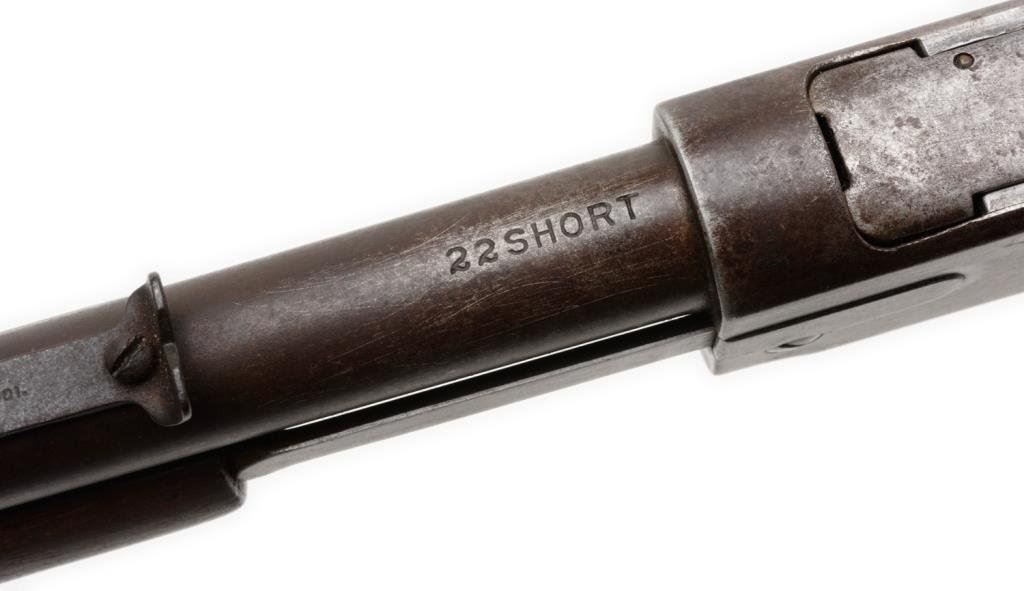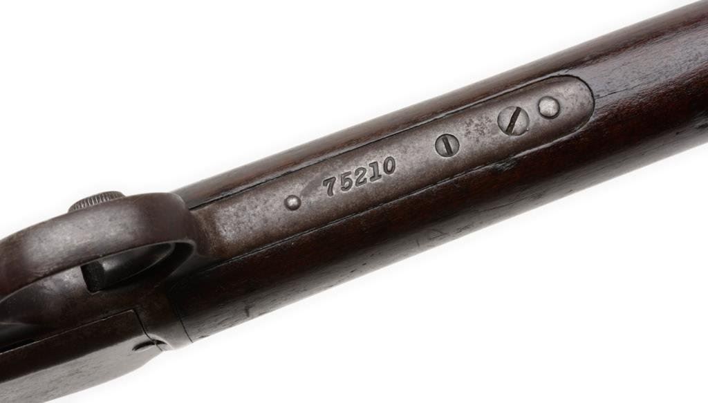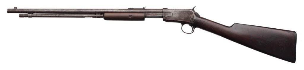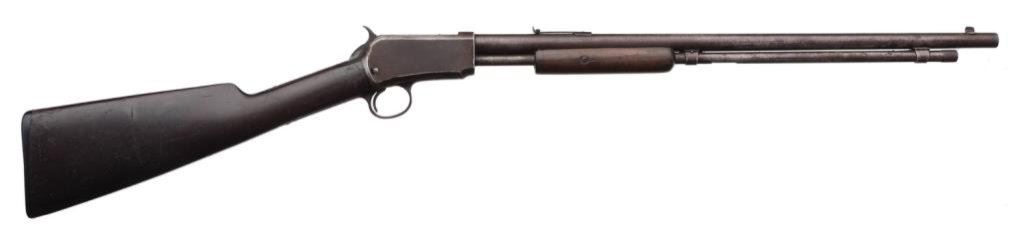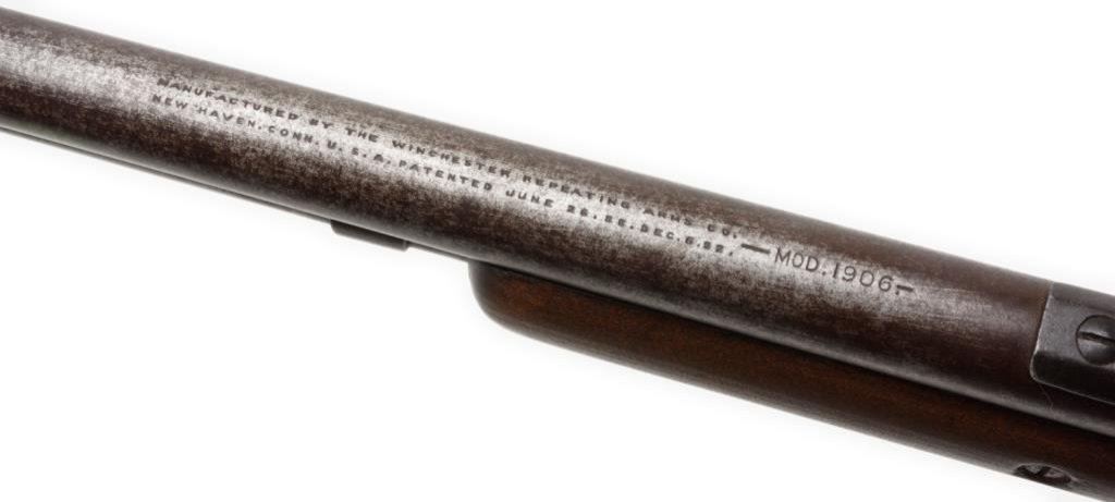 **Winchester Model 1906 pump action rifle, .22 Short caliber, 20” round barrel, S/N 75210, brown patina, good action and wood; fair to good overall. Est.: $250-$500.