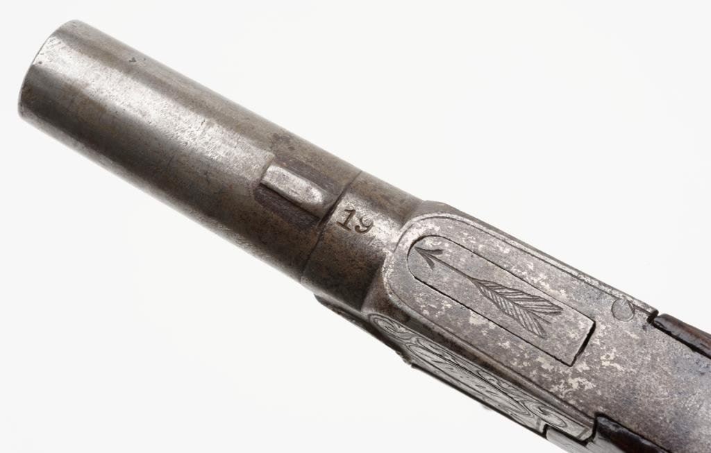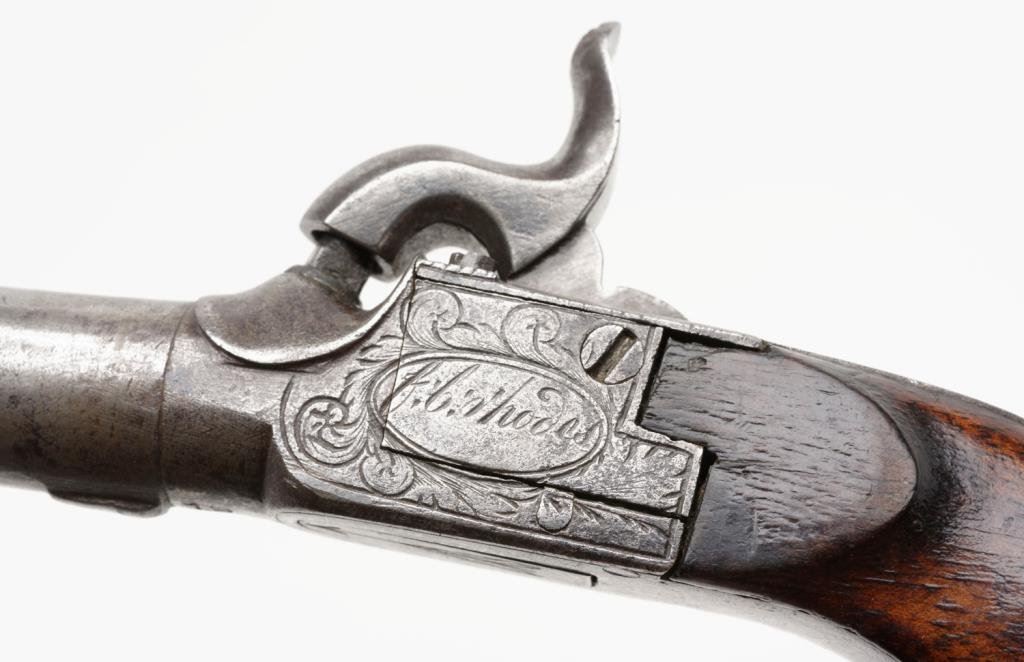 Percussion muff or belt pistol, .45 caliber, wood grips with N.Y. maker’s name inscribed on left side of frame; possibly “G.C. Shoder”; good action and grips; dark patina to metal surfaces. Est.: $400-$800.