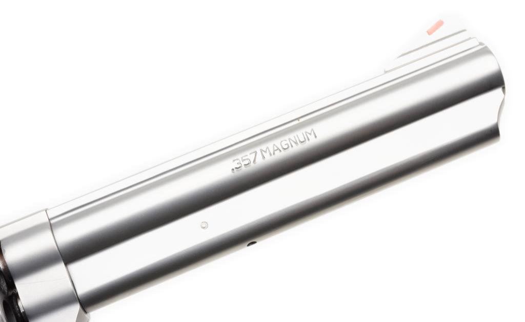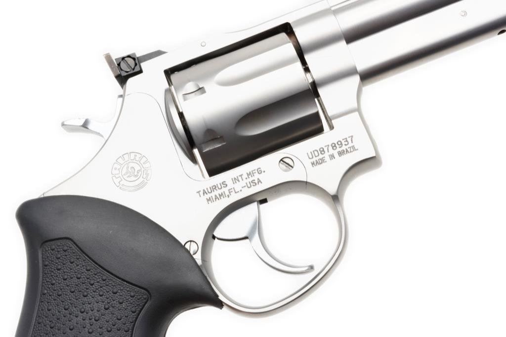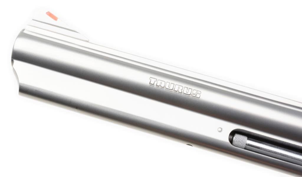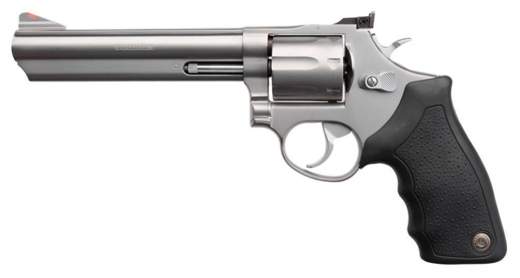 *Taurus revolver, .357 Magnum cal., serial #455566. The pistol is in overall very good to nearly excellent condition with a 6” barrel, ramp front with orange insert and adjustable rear sights. The pistol retains nearly all of its matte stainless finish with only slight handling marks evident. The rubber Taurus marked combat grips are in very good condition showing minimal use. The bore is very good, the action crisp and markings are excellent on this pistol. Est.: $300-$600.