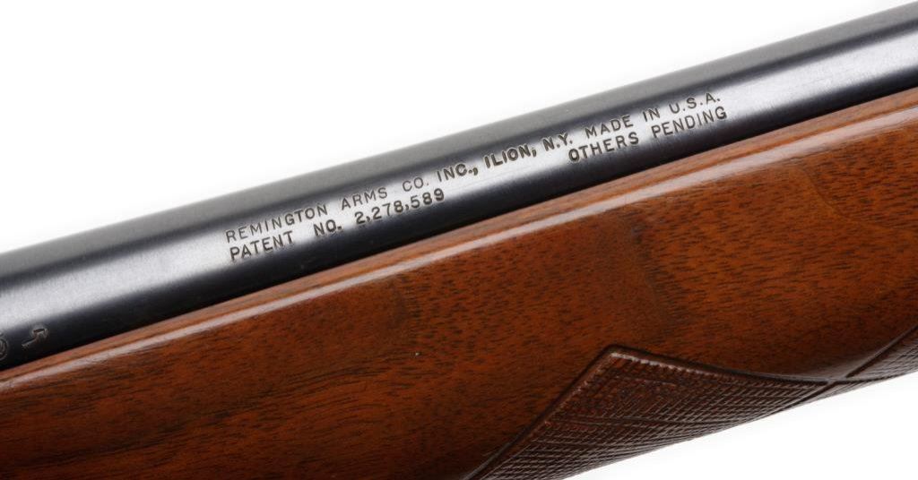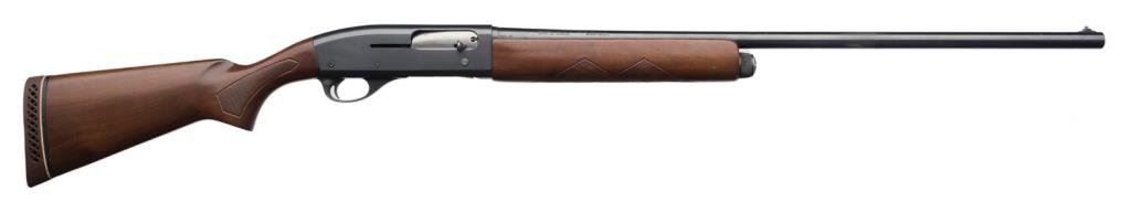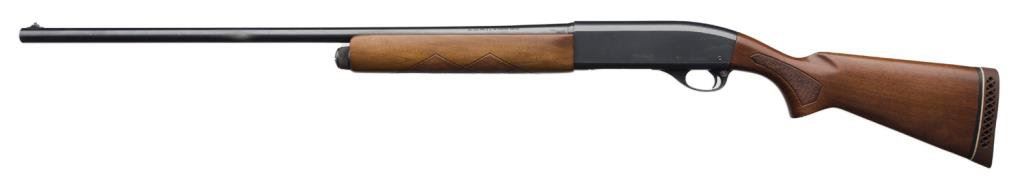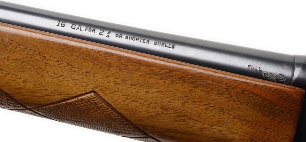 * Remington Model 11-48 semi-automatic shotgun, 16 gauge, serial #5533949. The shotgun is in overall very good condition showing the majority of its original blue. The shotgun sports a 28” barrel with a metal bead front sight. The barrel and action retain the majority of their blued finish with scrapes, scratches and slight finish loss consistent with field use. The checkered wood stocks are in very good condition as well. The butt stock ends with a white line ventilated rubber pad and a 13 3/8” LOP. The bore is very good as are the markings and action on this Remington. Est.: $250-$500.