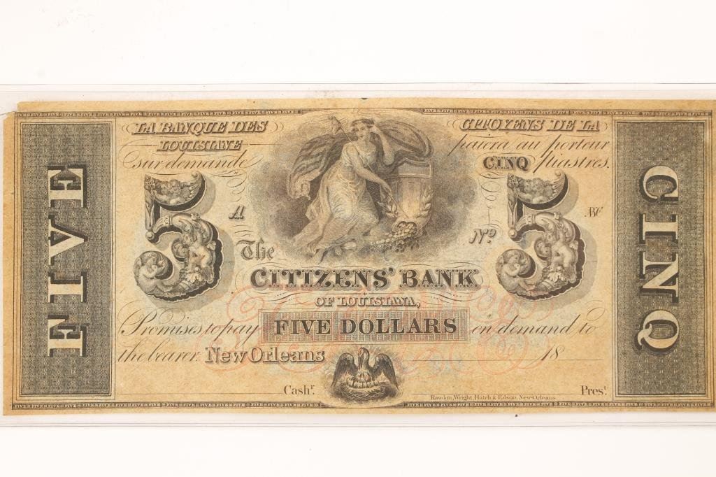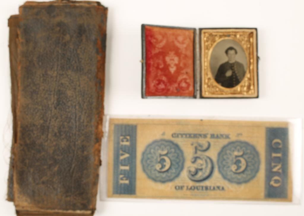 Tintype of Union soldier with Confederate jacket over his Union tunic (captured for comparison?) along with a large Civil War era bill fold and a 5 dollar note from Citizens Bank New Orleans with no date or signatures. Unissued and near fine. Probably pre Civil War. Est.: $150-$300