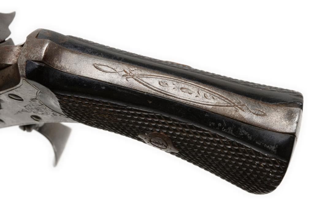 Pinfire revolver marked “Chottard St. Germain En Laye” on top of barrel, 7.65mm caliber, 3.5” octagon barrel, checkered ebony wood grips; good to very good overall with good action and markings. Est.: $175-$350.