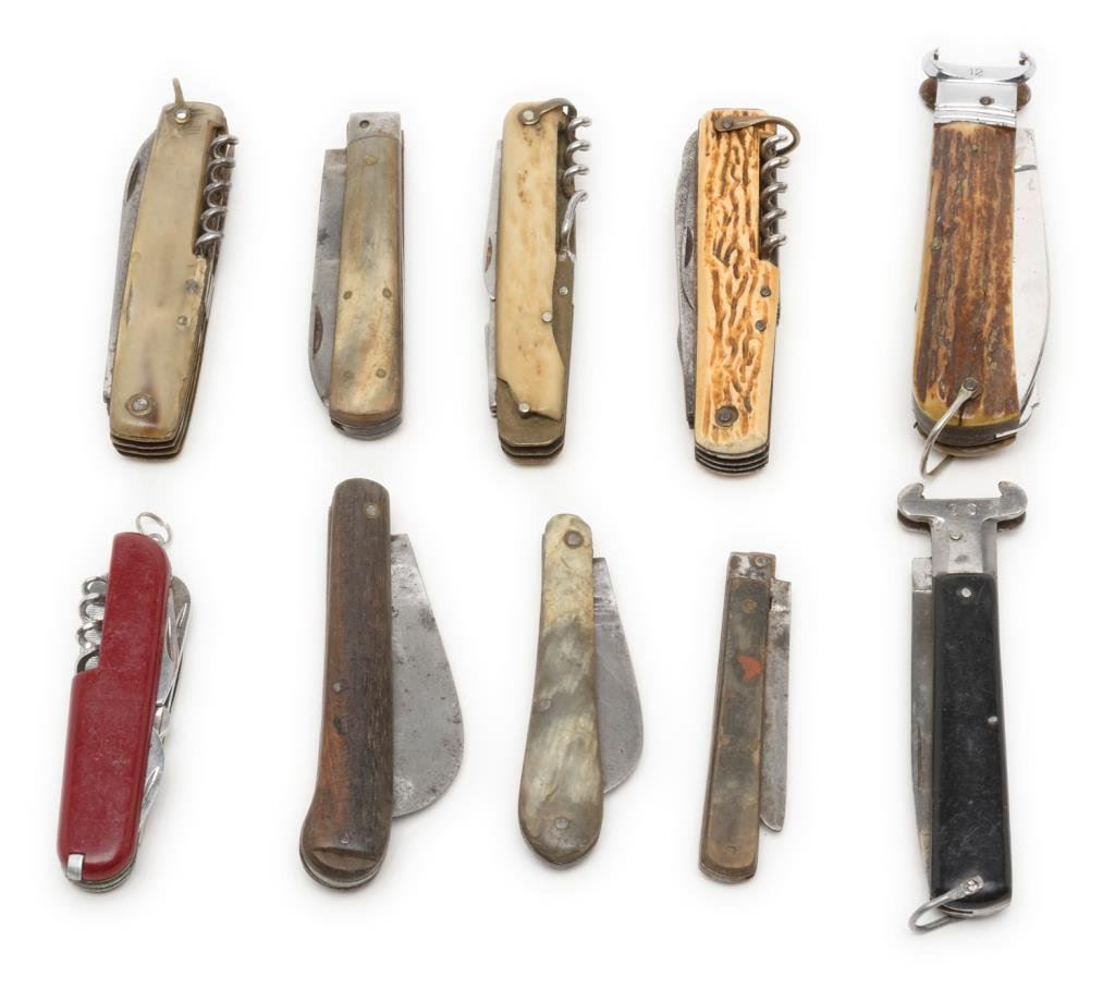Lot of 10 misc. pocket knives; some multi-blade/function; fair to very good quality in group. Late 19th to early 20th Century. Est.: $150-$300.