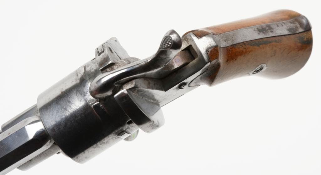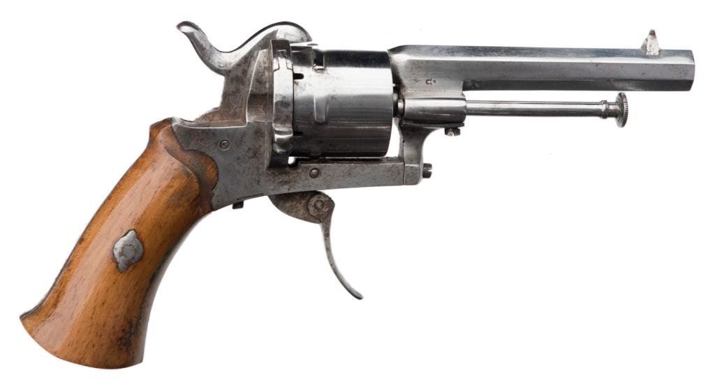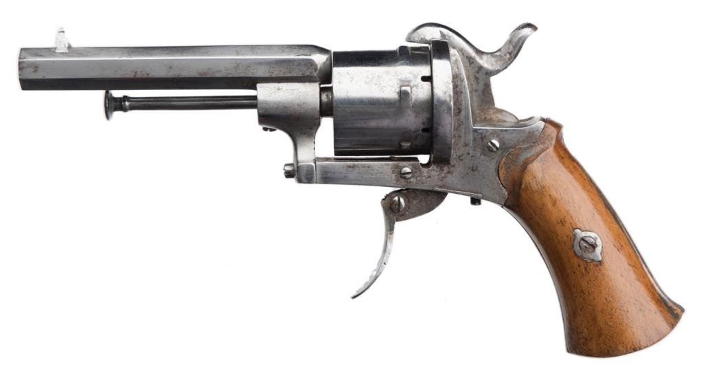 Pinfire revolver, 7.65mm caliber, 3.25” octagon barrel, bright finish, no maker’s marks, crisp action, good wood grips. Est.: $150-$300.