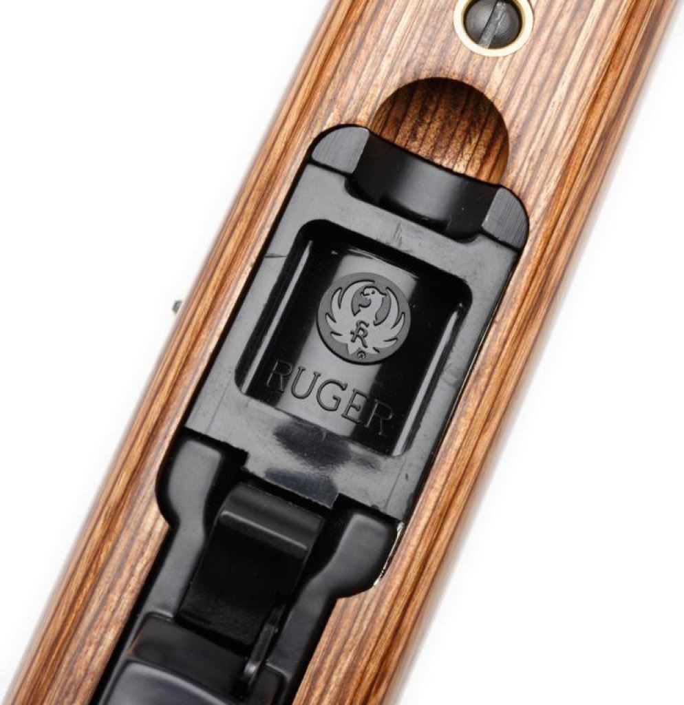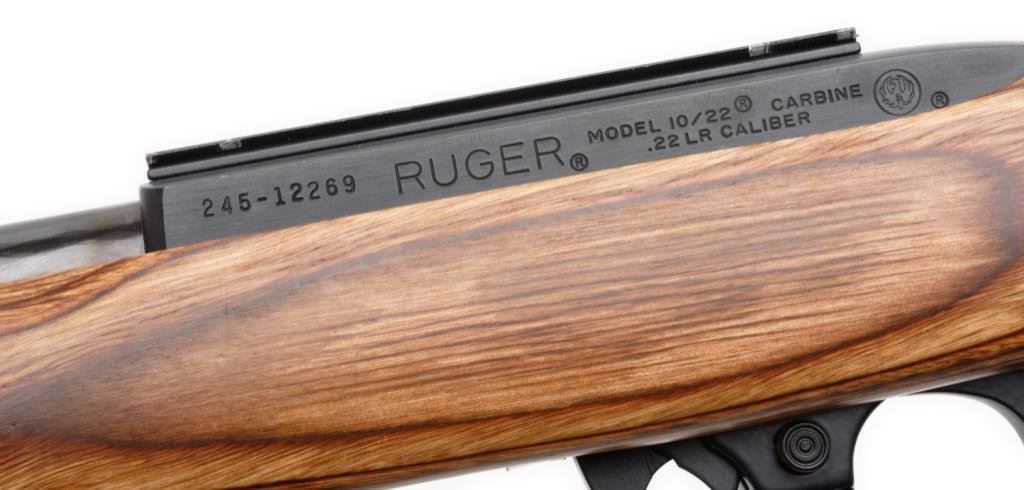 *Custom Ruger 10-22 semi-automatic rifle, .22 Long Rifle cal., serial #24512269. The rifle is overall excellent condition with a 20” “Ruger Hammer Forged” target bull barrel. The barrel and action nearly all of their blued finish with only small mars evident on the top of the receiver. A scope base has been added at some point. The wood laminate stock shows use with small scratches and scuffs, however is in overall very good condition. The stock ends with a Ruger marked rubber pad and a 14” LOP. The action is crisp, bore very good and markings sharp on this nice target 10-22. Est.: $250-$500.