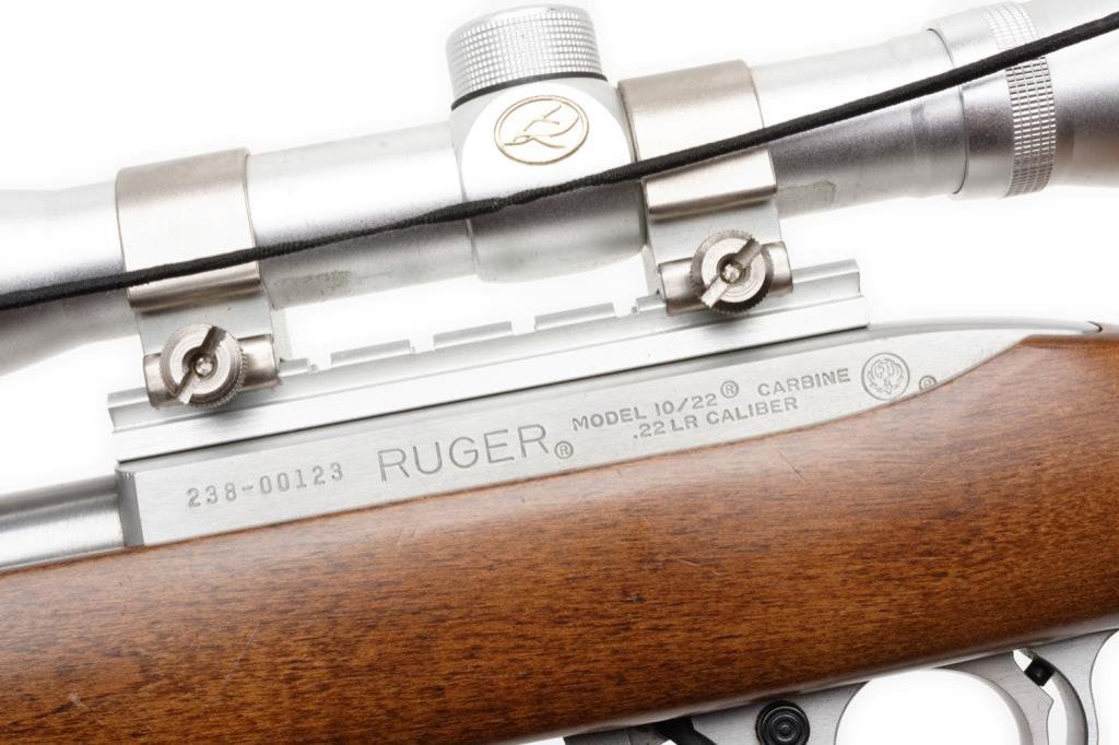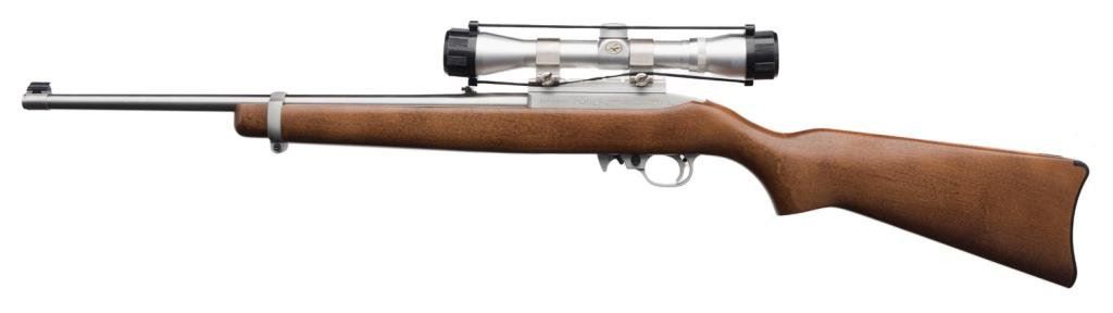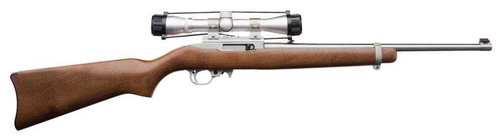 *Ruger Model 10/22 semi-automatic carbine, .22LR caliber, no magazine, 18.5” barrel, S/N 238-00123, mounted with a Redhead 4X32 scope displaying fine optics, stainless steel, wood stock in overall fine condition showing little use. Est.: $200-$400.