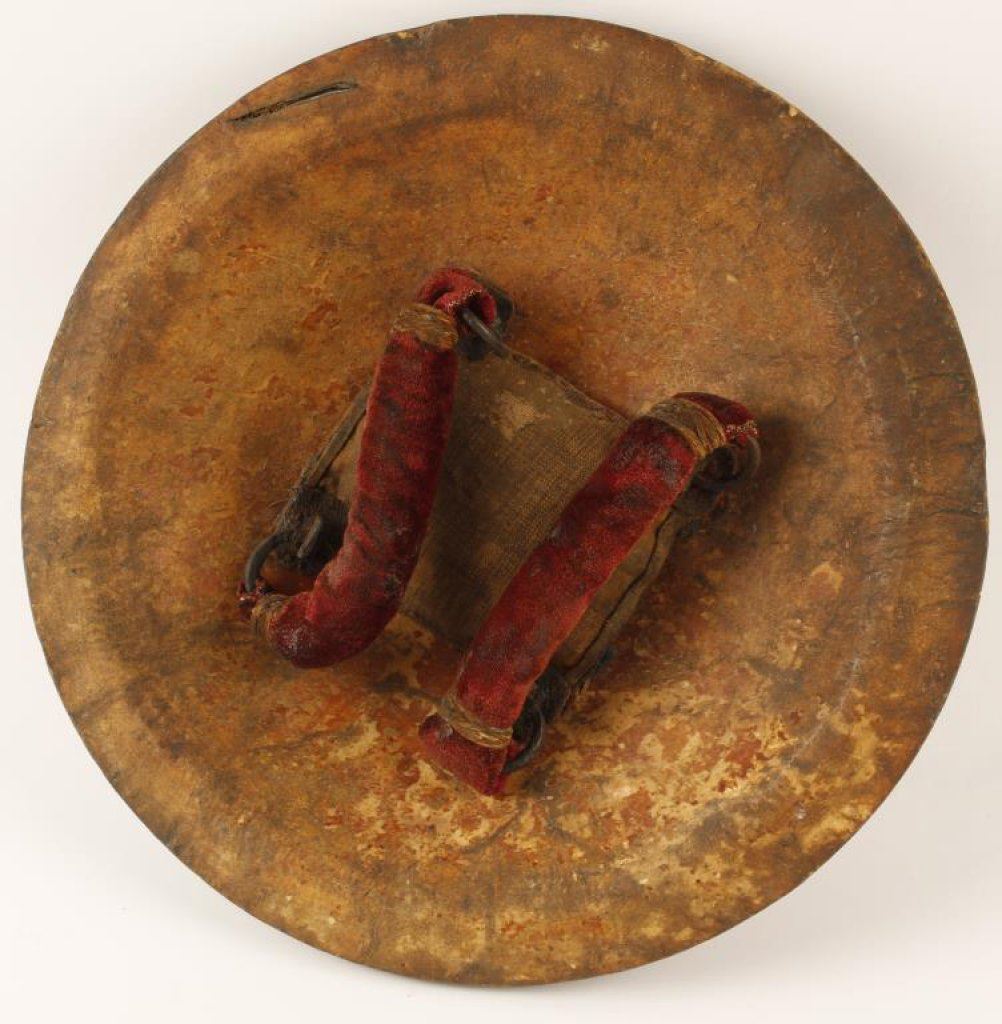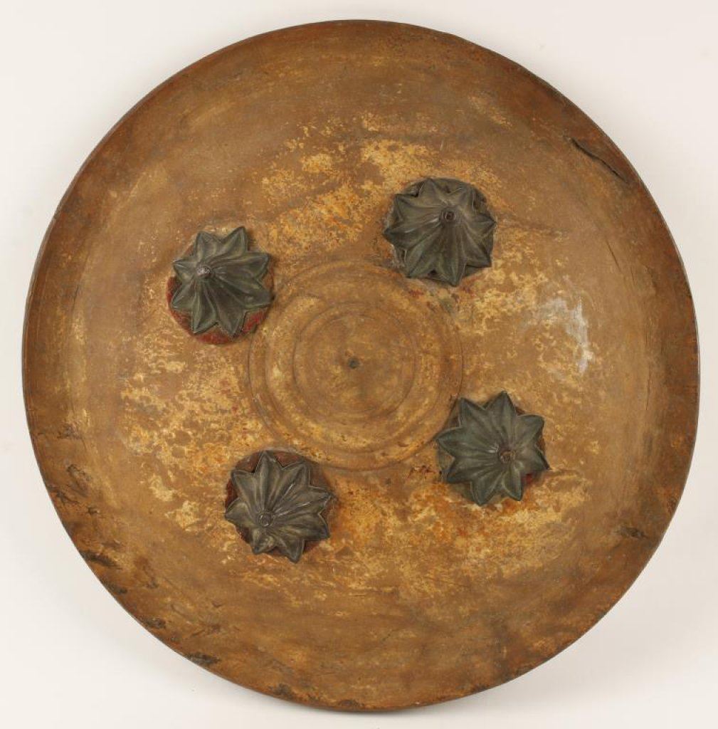 Indo-Persian knife shield; approximately 13” in diameter; painted on thick boiled hide; ca 19th Century. Est.: $150-$300.
