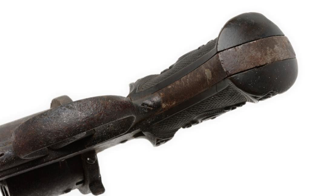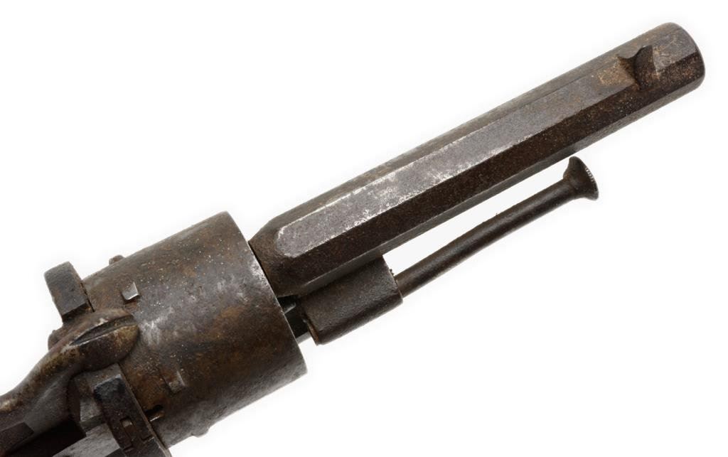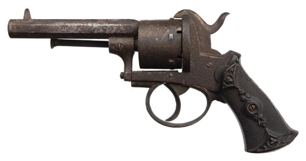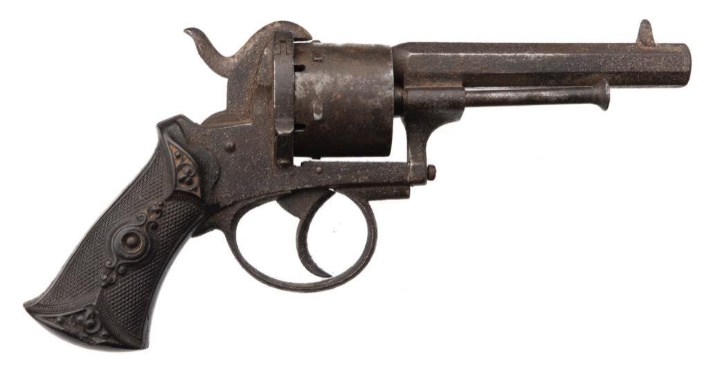 Double action pinfire revolver, 9mm caliber, 3.75” barrel, no visible S/N, checkered and raised gutta percha grips in overall fair only condition with heavy dark patina and areas of erosion, working action, grips show a couple old losses and a crack at the top of the left grip. Est.: $90-$180.
