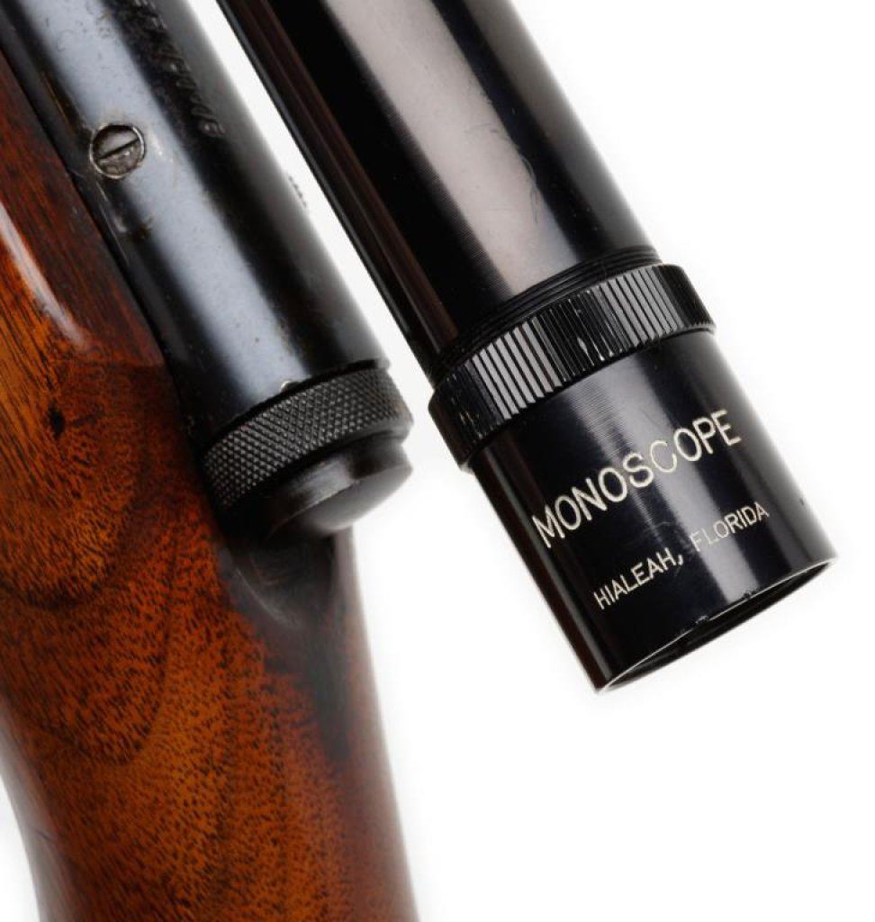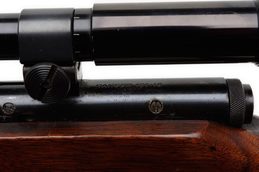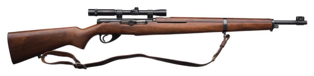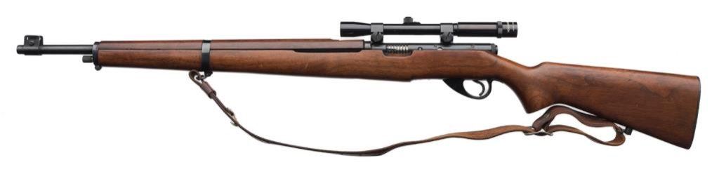 *Mossberg Ranger 101*16 Model semi-auto rifle, .22 caliber, 24” round barrel, no visble S/N, blued finish, full length wood stock with leather sling and mounted with a Monoscope displaying good optics. This rifle is in overall fine condition with some scattered erosion to the finish at the muzzle, fine action, markings, very good bore and fine wood stock. Est.: $200-$400.