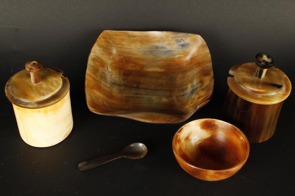 Lot 1919 Seven piece set of old heat formed horn pieces including two containers wi