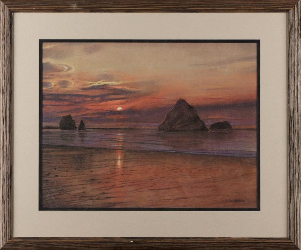Framed and beautifully matted color print of a Sunset at the Ocean, possibly Morro Bay, CA by Don Marco, approximately 20” x 24” overall. Very restful. Est.: $75-$125.