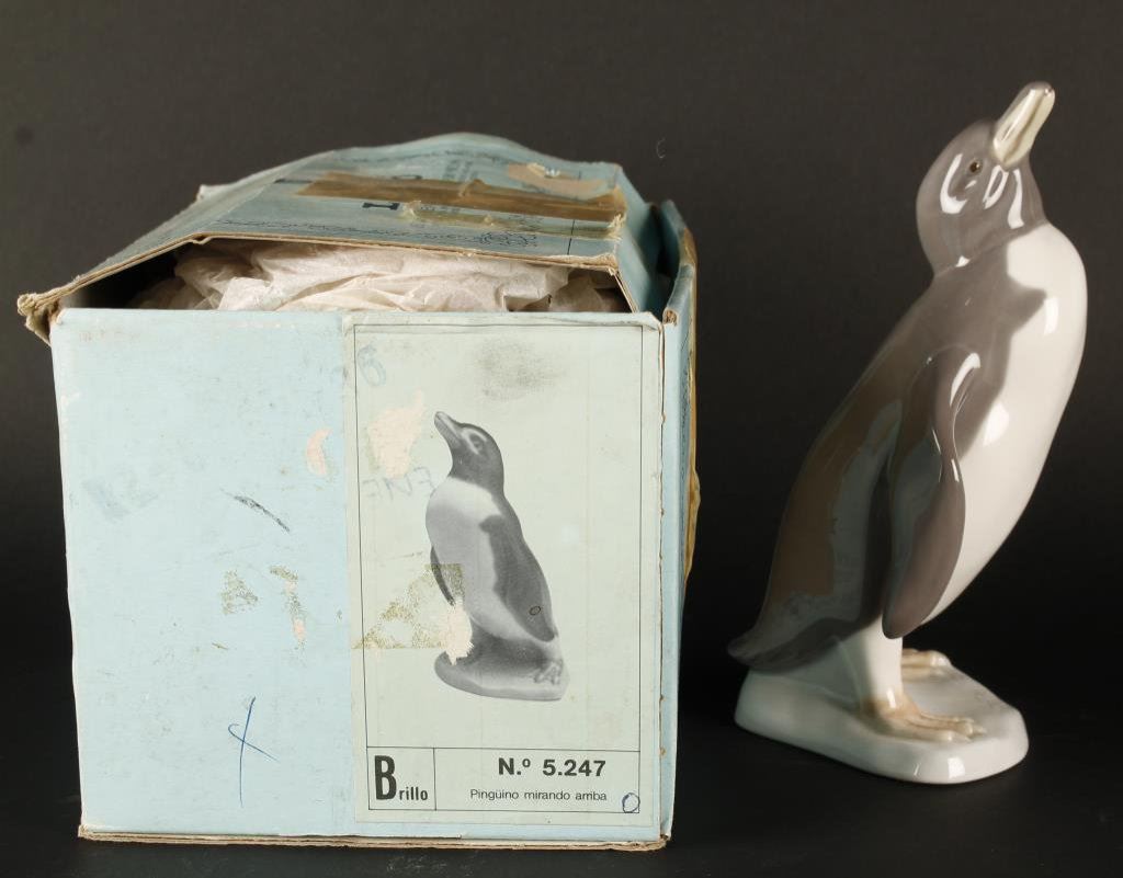 Lladro figure of a penguin in factory cardboard box, approximately 7” in height and in fine condition at time of description; entitled “Penguino Mirando Arriba”. Est.: $100-$200.