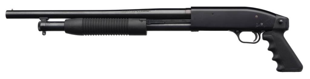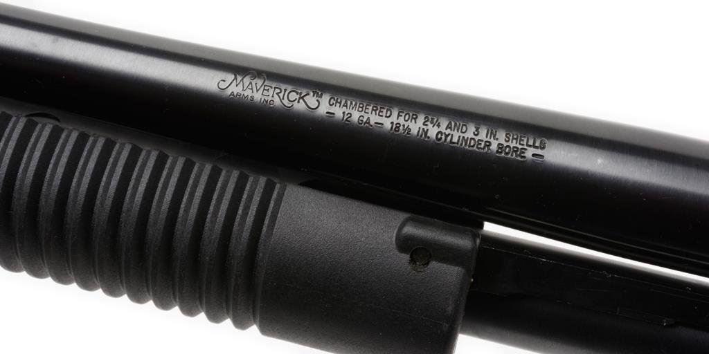 *Maverick pistol grip pump action shotgun, 12 gauge, serial #MV684088. The shotgun is in overall very good condition with an 18” blued barrel and brass bead front sight. The shotgun retains the majority of its blued finish with some scratches and mars on the receiver. The plastic fore end and pistol grip are in overall very good condition showing small mars and wear consistent with use. The bore is very good, action crisp and markings are sharp. Est.: $150-$300.